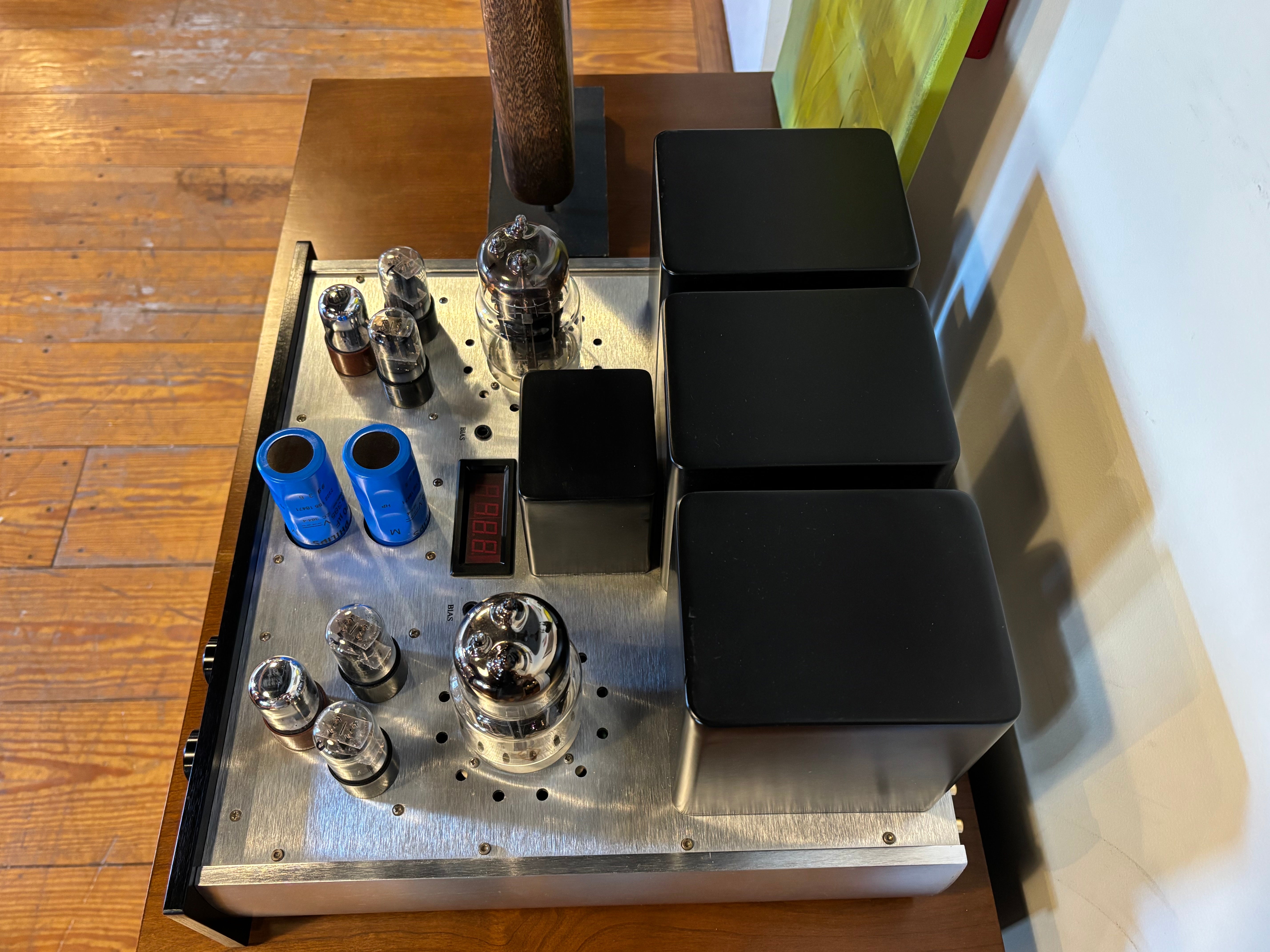 So exotic tube amp fans... here we have an Antique Sound Lab KI-22 FOX DT integrated amplifier. This amazing amplifier produces 22 Watts of single ended triode power with it's big Russian 6C33C-B output tubes. This is no delicate 300B sounding SET amplifier. This is a thunder & lightning tube integrated amp with deep bass extension that will take exceptional control over the drivers in your speakers. Heavily reviewed, the original version of this amplifier and said it was a giant killer, with no competition anywhere near its price. We gotta agree with that assessment. This being the newer updated version replaces the front mounted sliding bias meter with a top mounted digital LED readout for precision biasing of the 6C33C tubes.