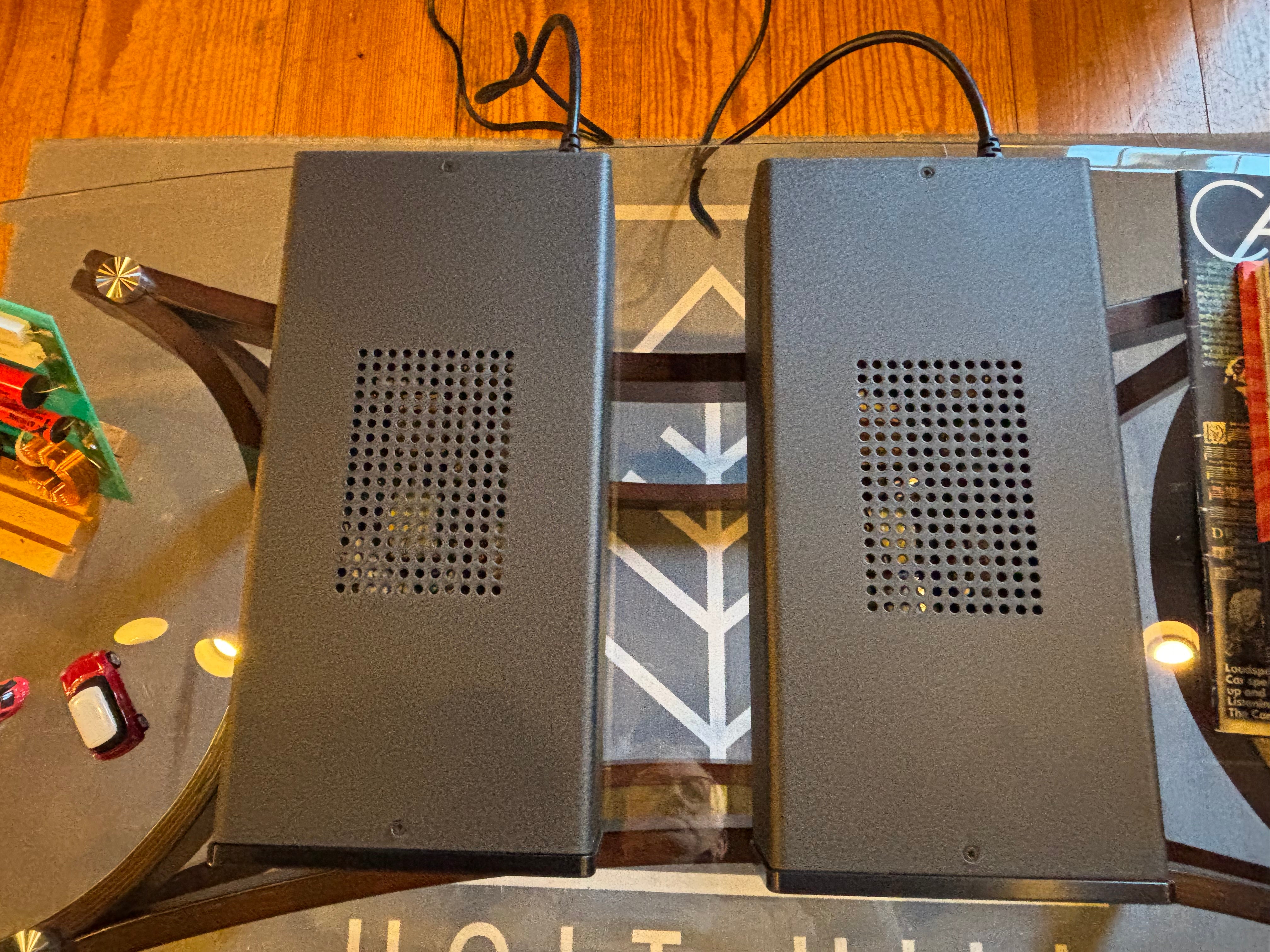 This particular set are in as-new condition literally like they just came out of the package for the 1st time. Yep, that clean. Original box & packaging too - like we were the 1st person to actually plug these in. No disappointments here, they will rock the house and bring all the meaty muscle of a much bigger, heavier and wildly more expensive set of monos.