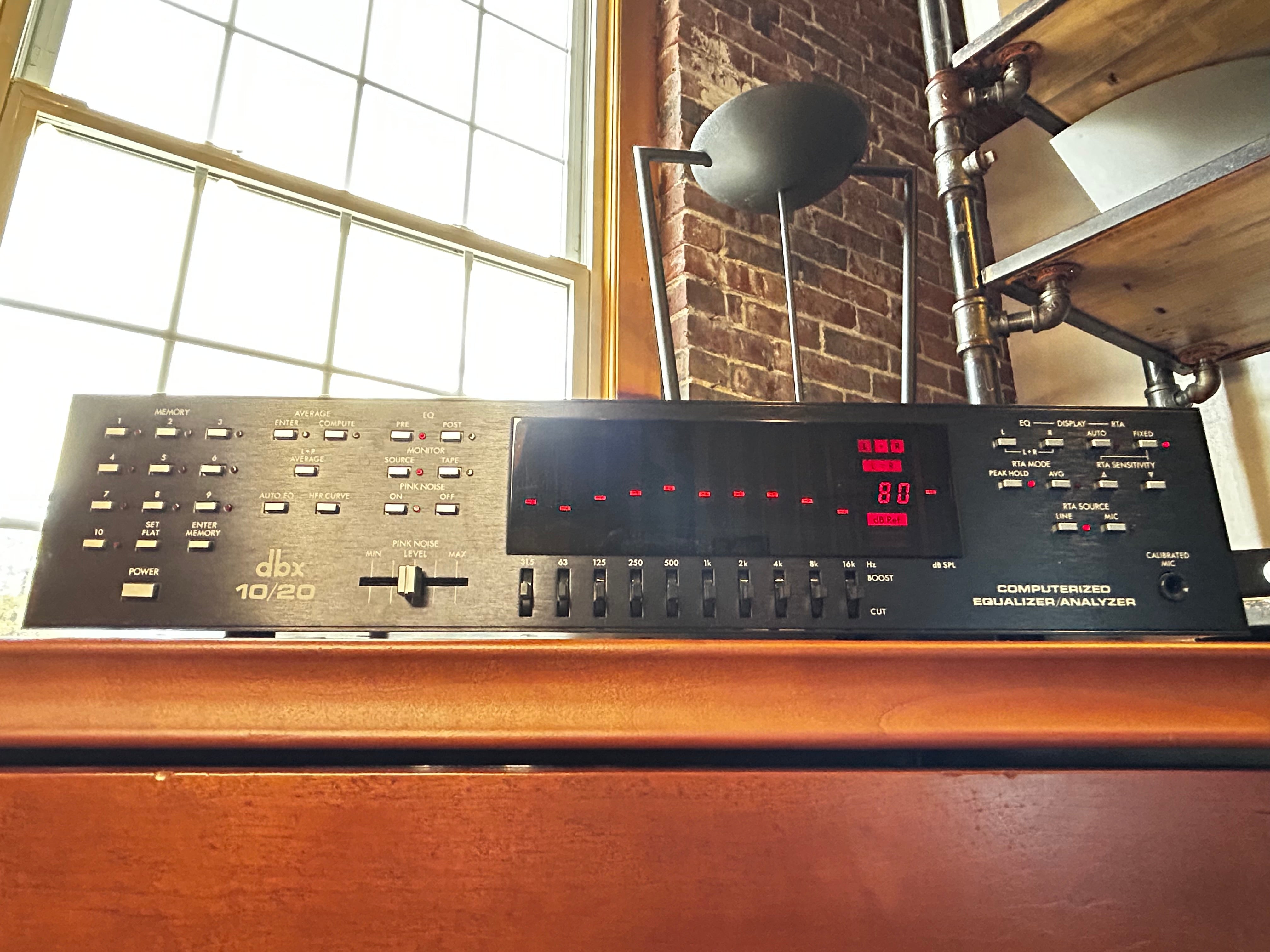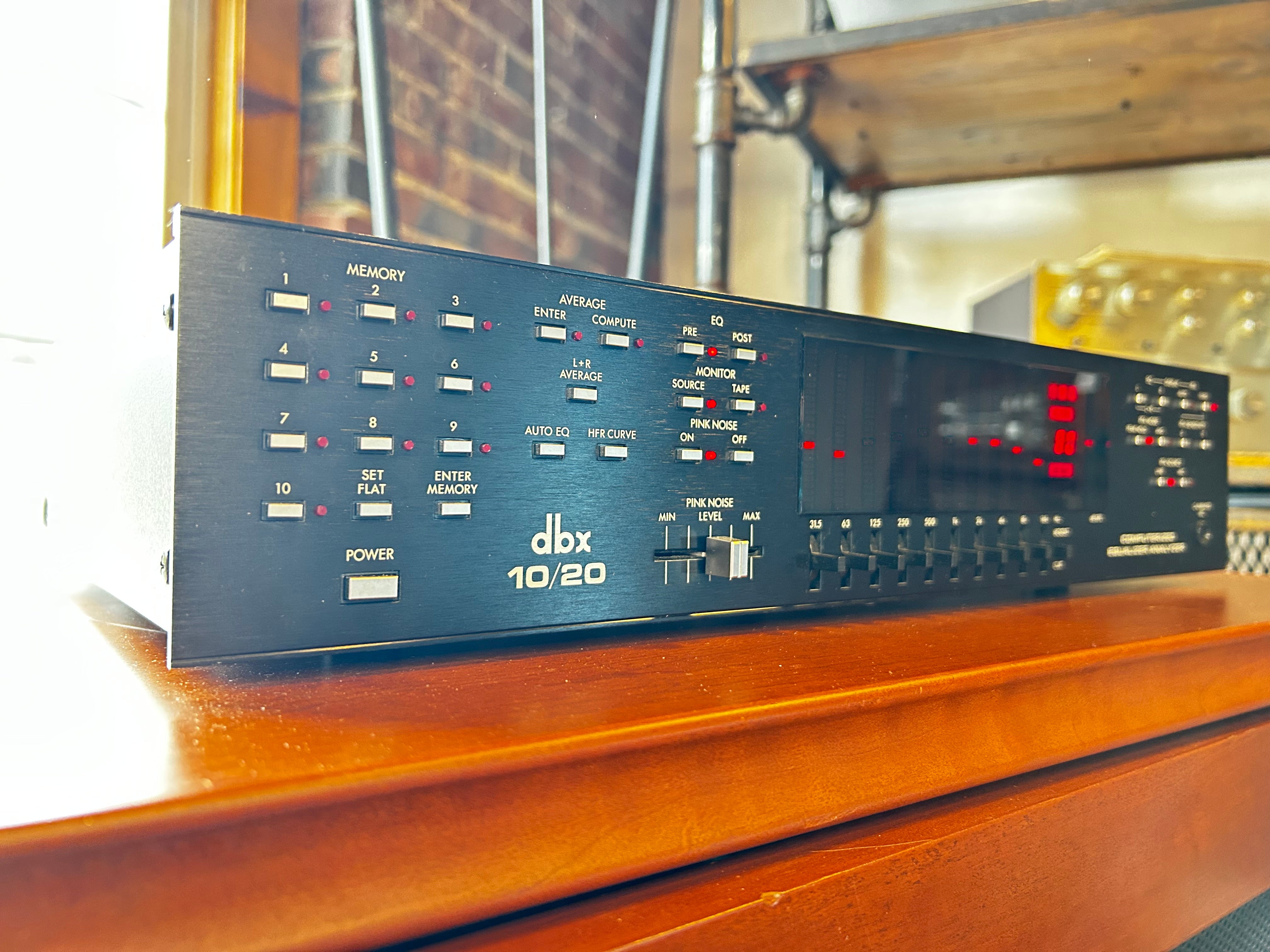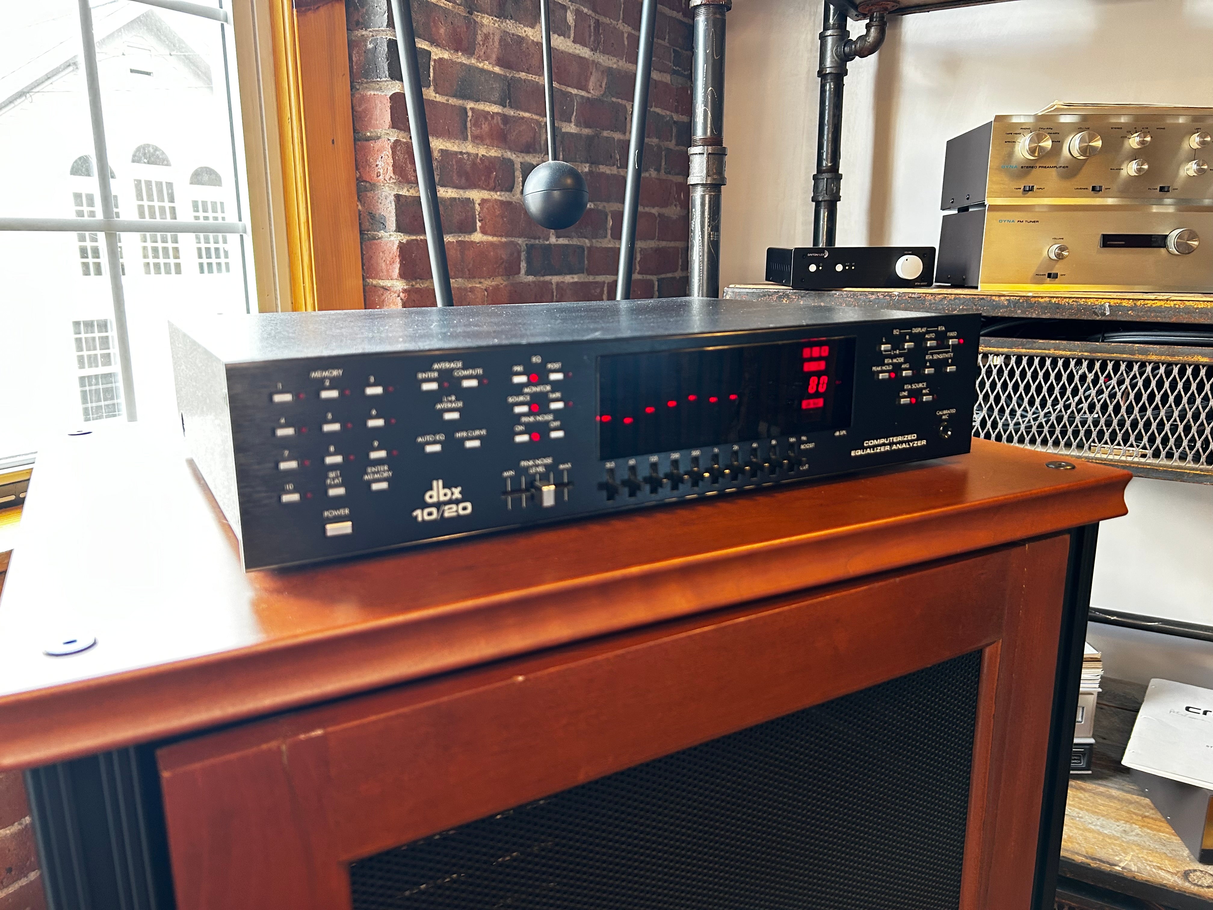 The dbx 10/20 was a leap forward in graphic EQ technology at the time.  Considered a "Super EQ" by many even today, the 10/20 is a computerized 10-band graphic equalizer from the 1980s that functions as a real-time spectrum analyzer, pink-noise generator, and sound-pressure-level (SPL) meter, providing automated room correction by analyzing sound and adjusting frequency levels for an optimal frequency response. It features precision switches for manual adjustments, LED readouts, and can equalize speakers individually or as a stereo pair.
