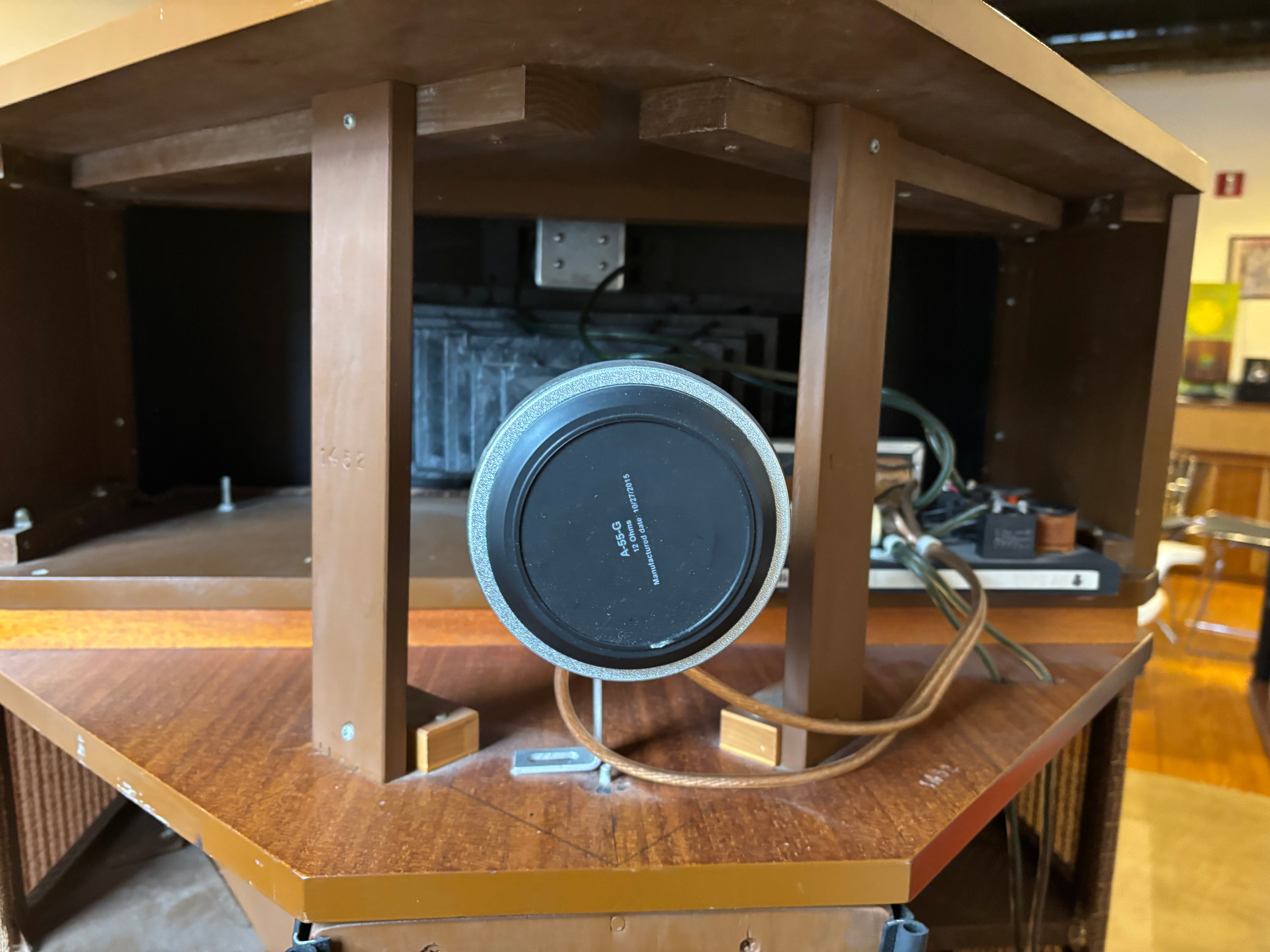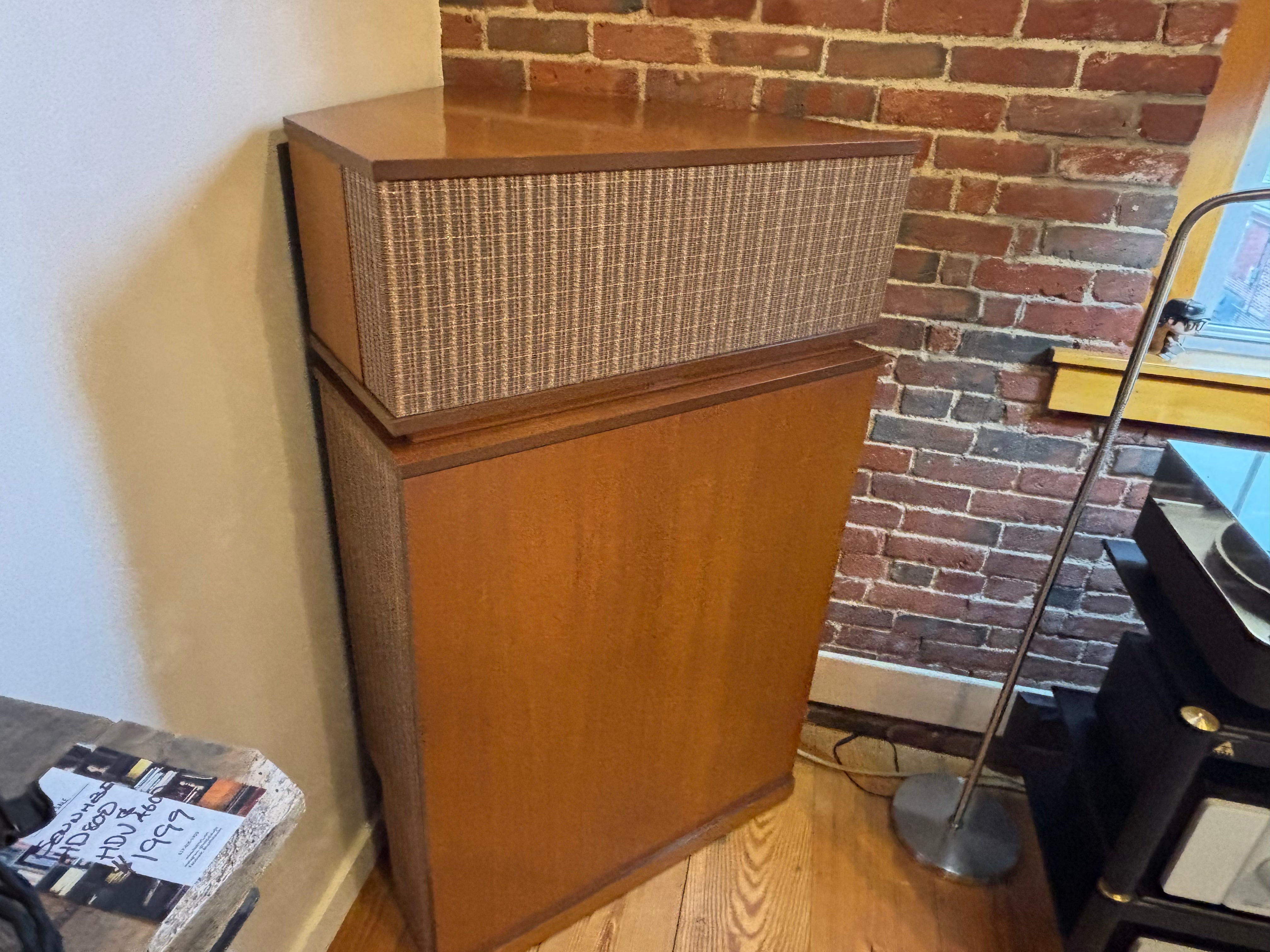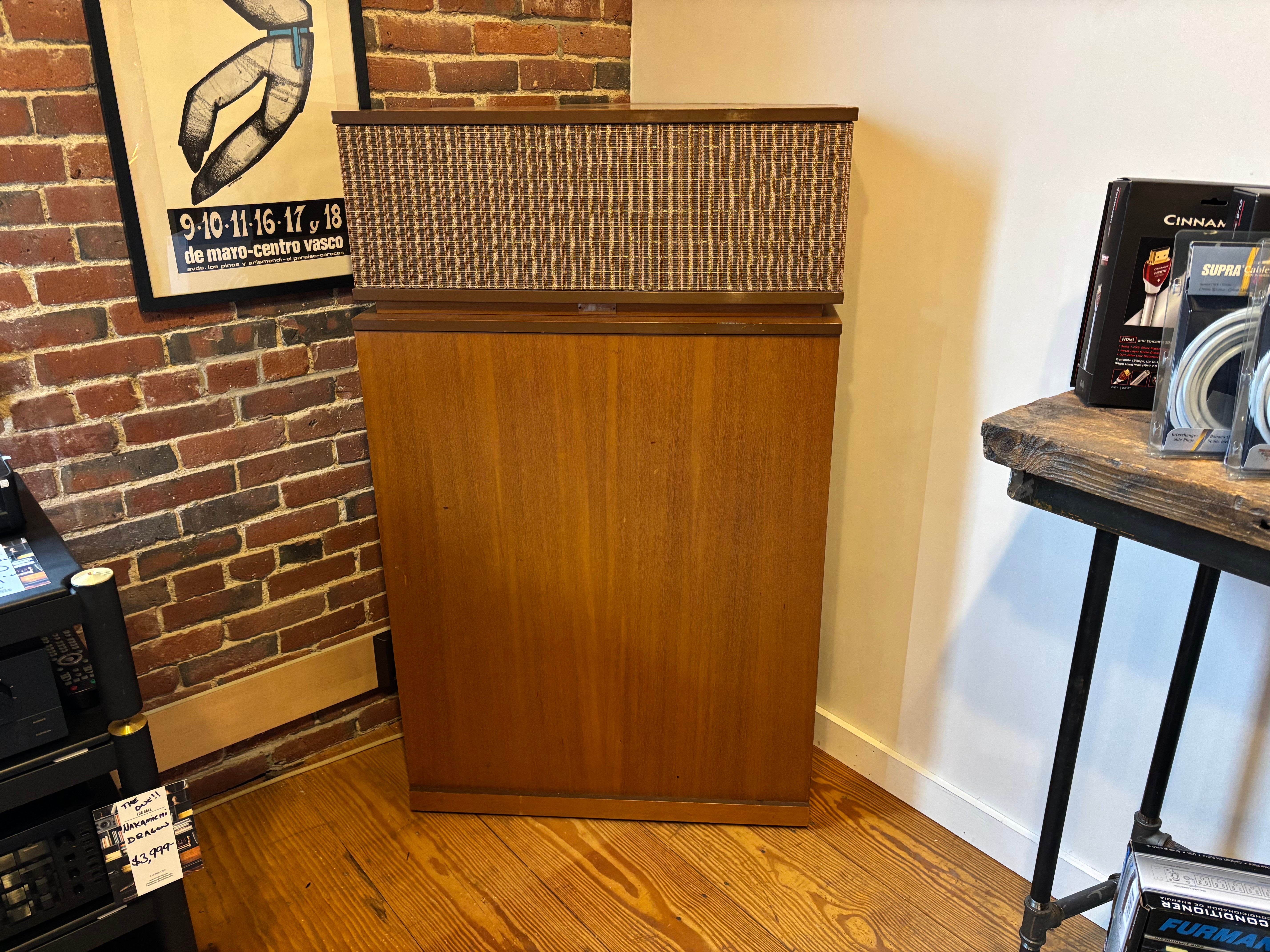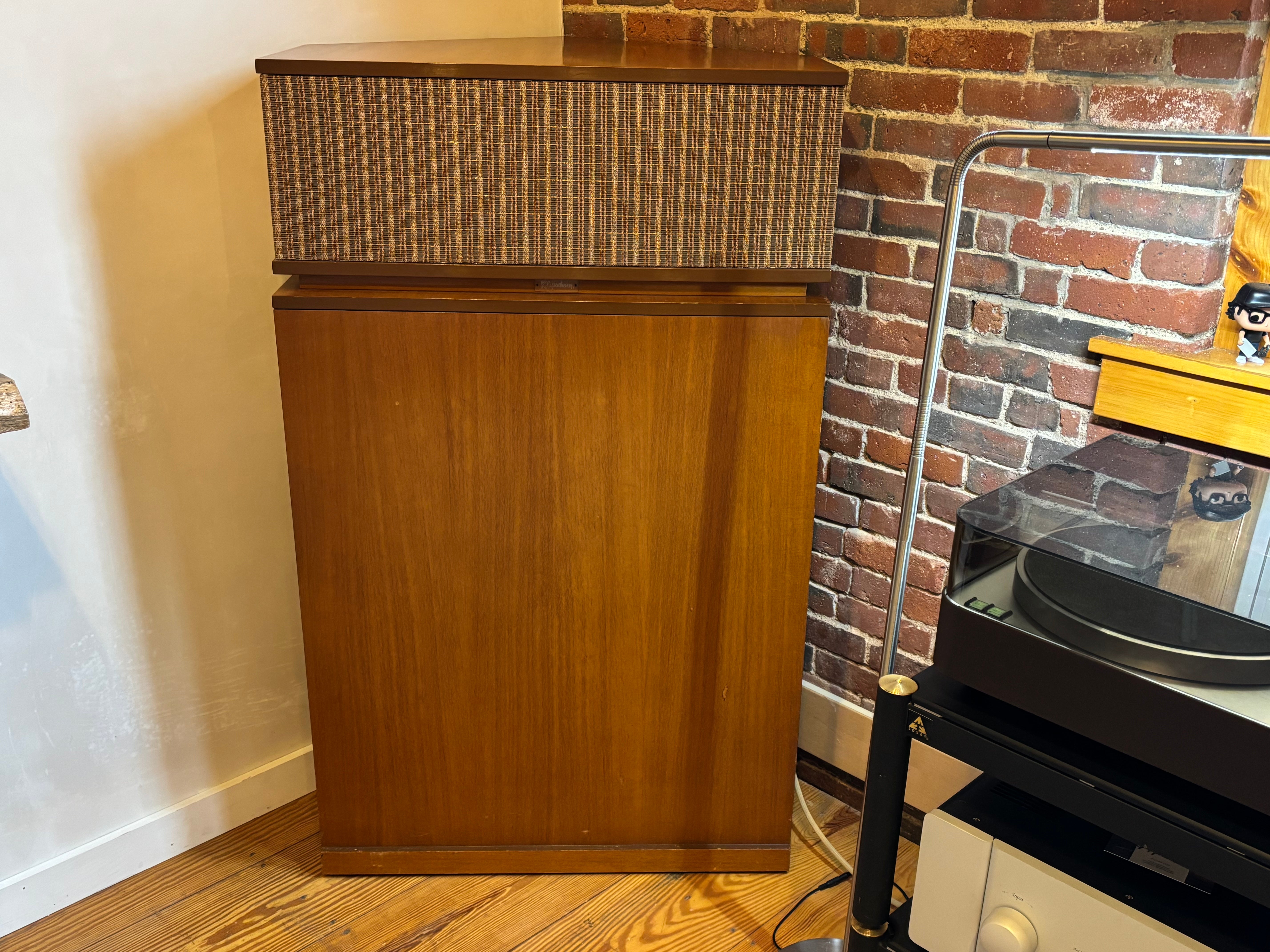 A fabulous set capable of earth shaking performance - this particular system was powered by a pair of Threshold S1000 monos; why, we don't exactly know but can guess that the previous owner may have, at times, needed to light up an aircraft hangar. Performance is exceptional. Just what one would expect from a speaker design that has remained largely unchanged for an entire human lifetime. Have to say this, they are exceptional and play better that MANY of the K-Horns we have experienced. Really special!
