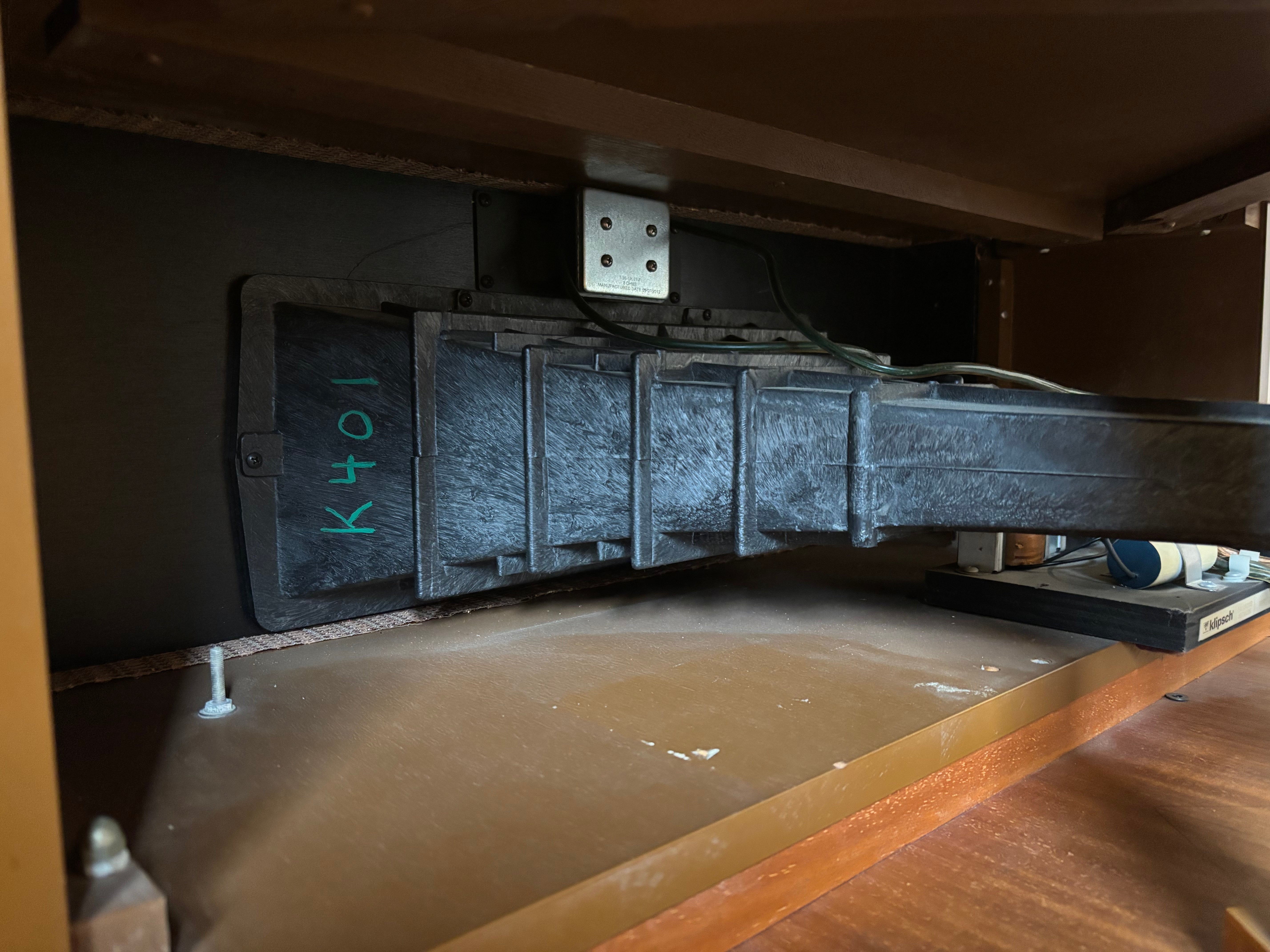 Folded exponential bass horn (requires corner placement for proper performance)