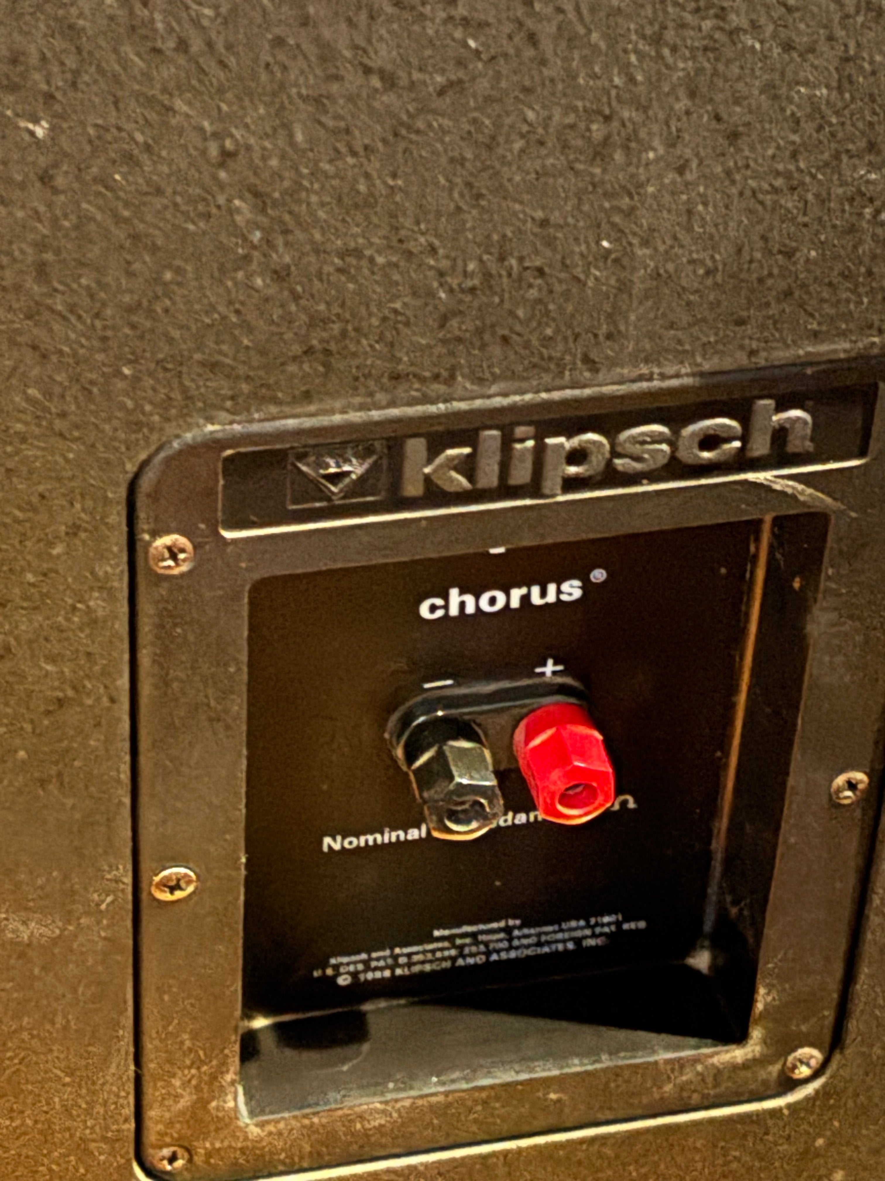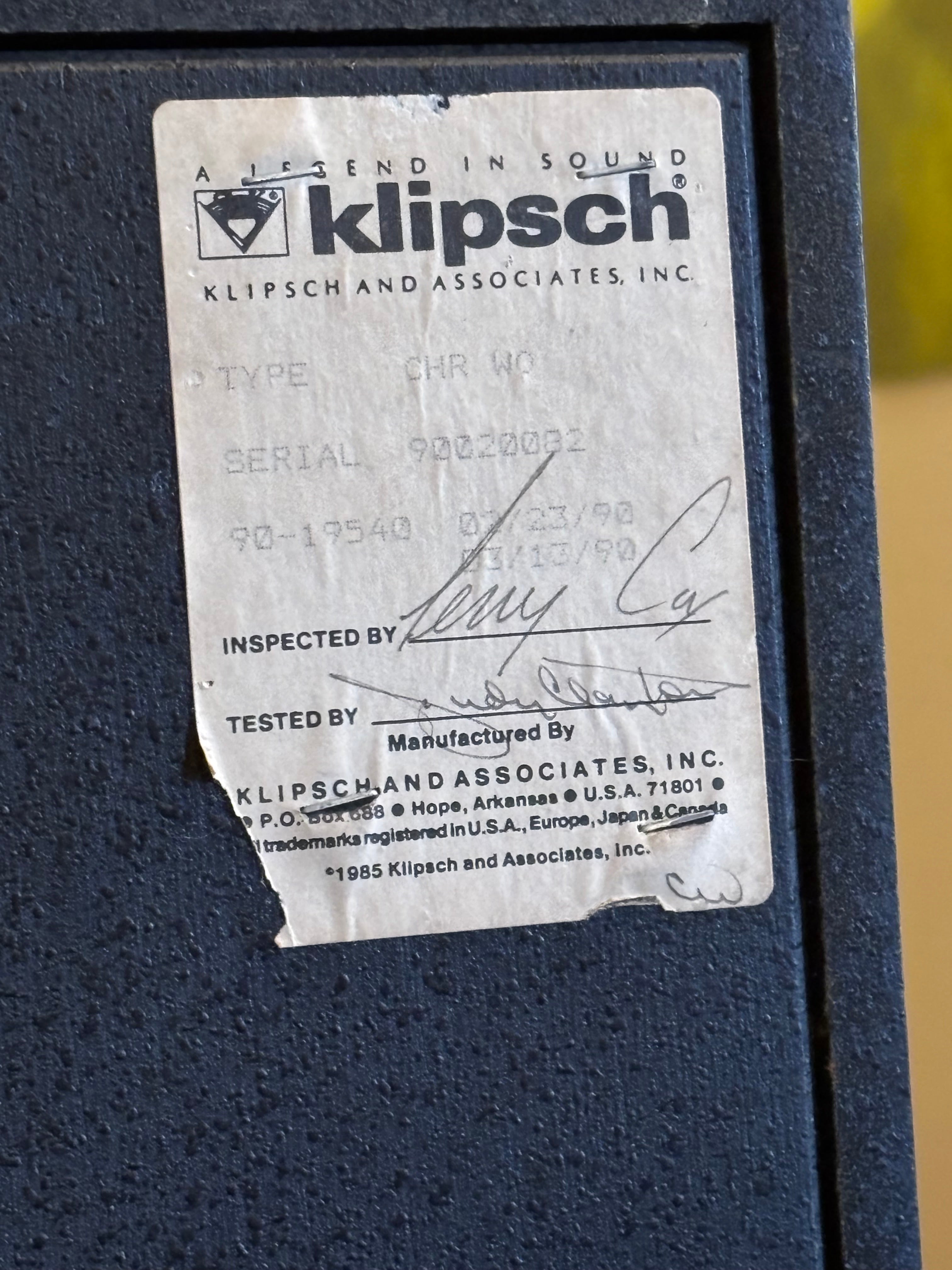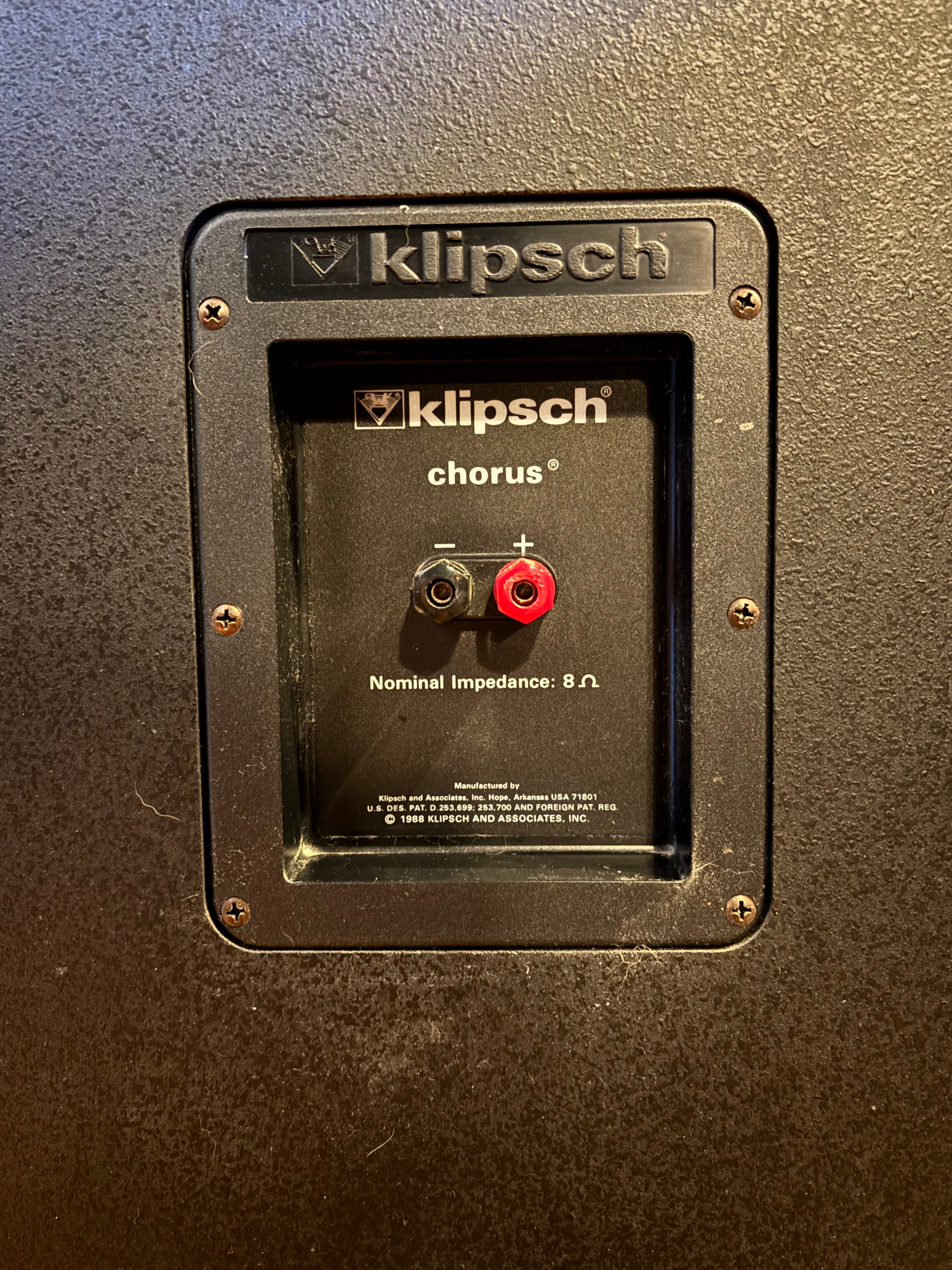 The Klipsch Chorus was introduced in 1987 and ran though 1990. It was eventually replaced by the series II which ultimately ran til 1996. The Chorus was the 1st generation large-format three-way design for customers wanting the benefits of Klipsch's game changing horn designs, but in a smaller footprint than the massive Cornwall.  The Chorus was a huge hit and this speaker system paved the way for the big, efficient albeit more user friendly horn designs.