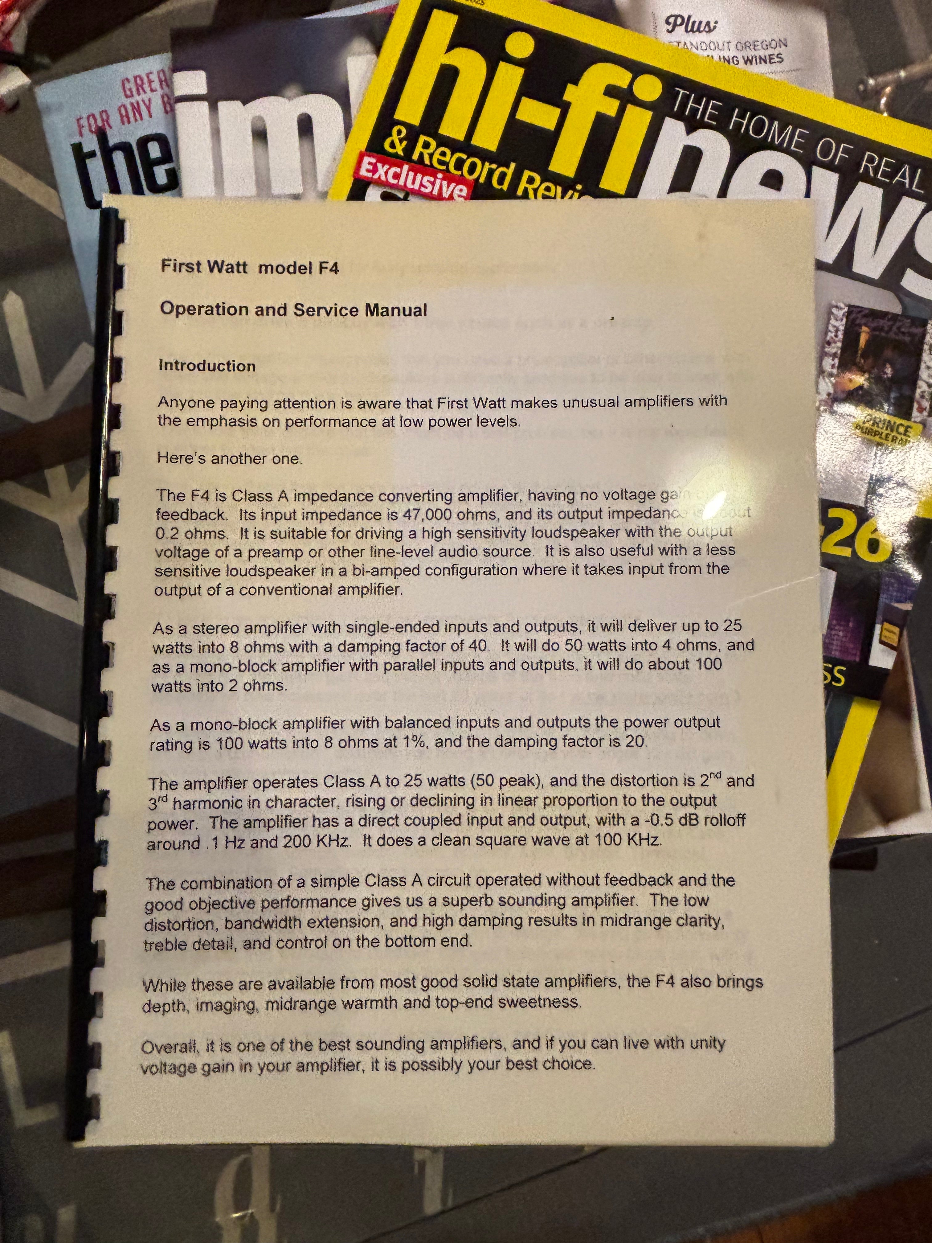 Overall, it is one of the best sounding amplifiers, and if you can live with unity voltage gain in your amplifier, it is possibly your best choice. Here's a great full review of this outstanding piece... https://6moons.com/audioreviews/firstwatt6/f4_3.html