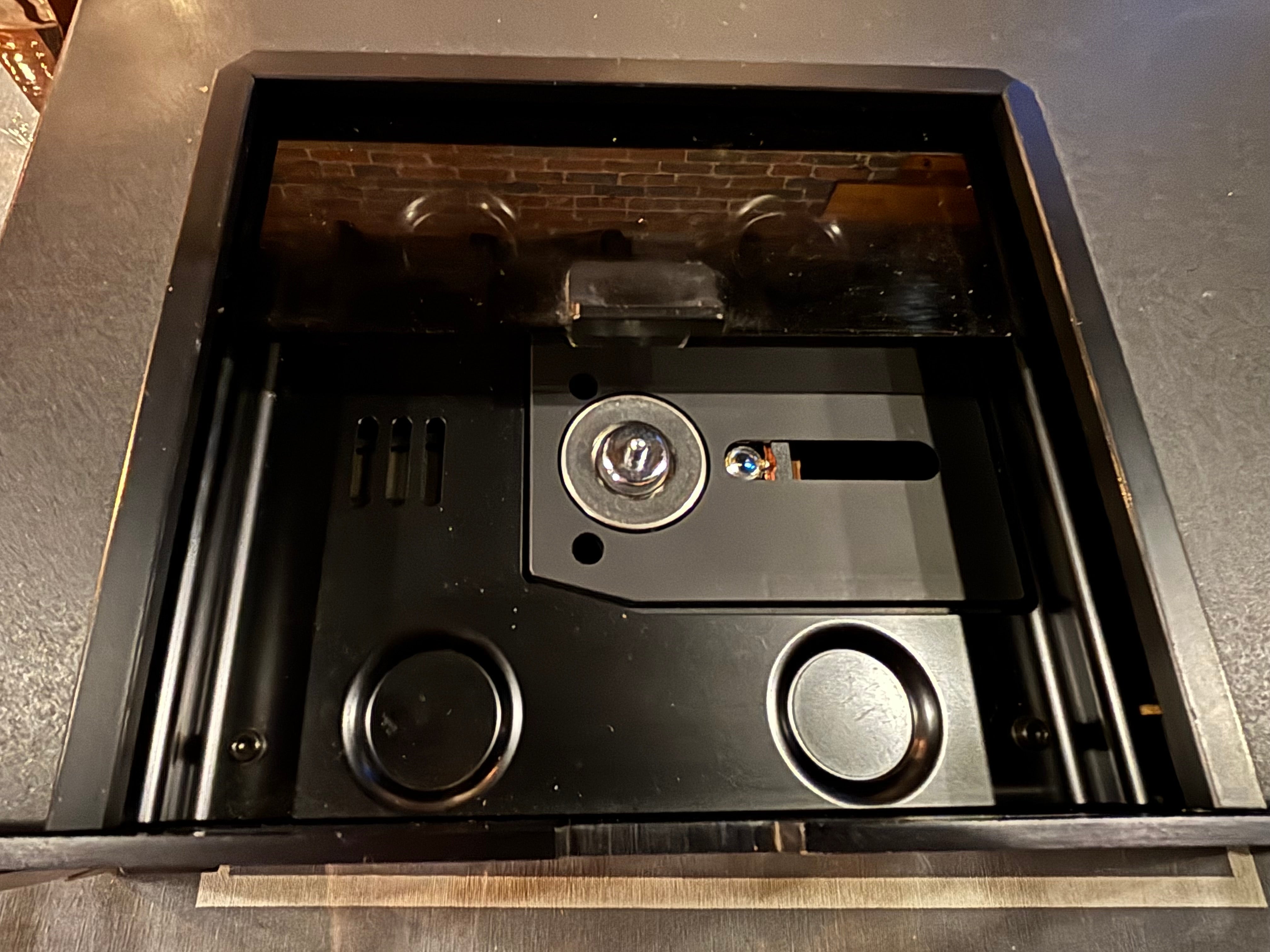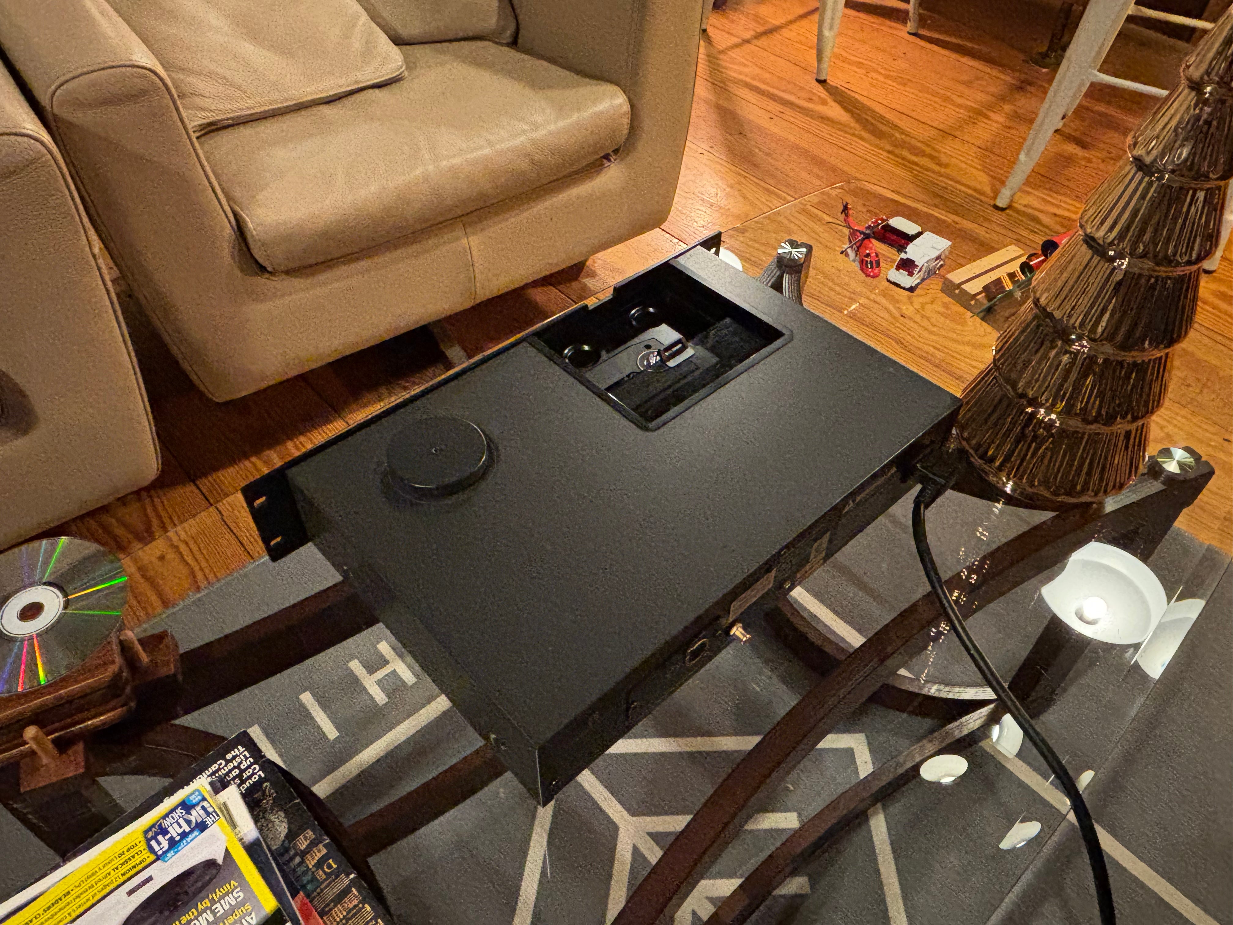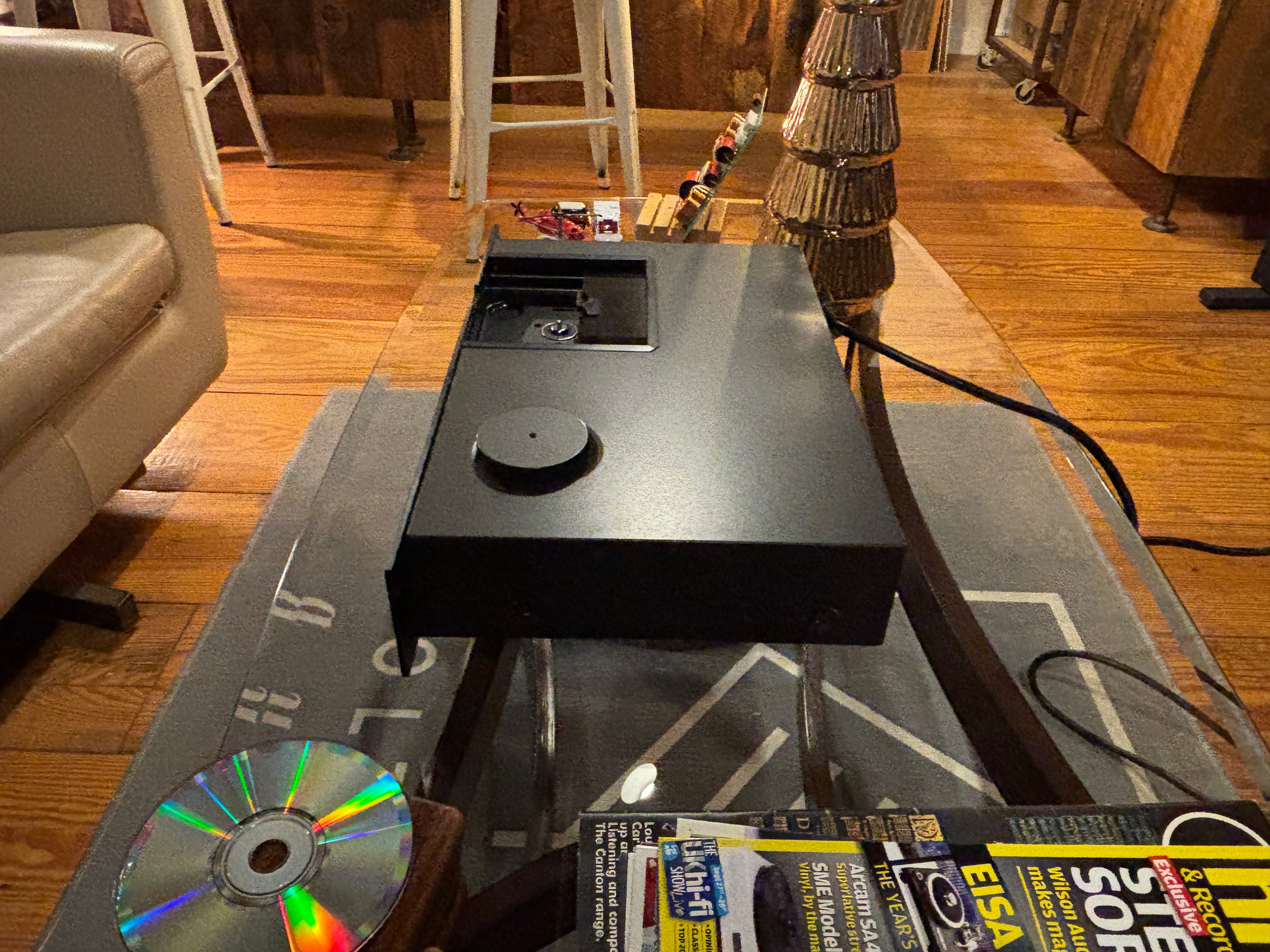 The entire unit has a very high mass and is heavily damped, and the massive separate disc clamp helps achieve a solidity of CD-spinning that could not be matched by any drawer-type CD transport. With a heavy-duty phosphor bronze main bearing, there is no worry that the weight load of the clamp might destroy the motor bearing, as with some CD tweaks. And one doesn't need to remember each time to turn the CD upside down as required by the Pioneer-type "stable platter" design. One does need to remember to put on the disc clamp and slide shut the plastic cover or the transport will not operate.