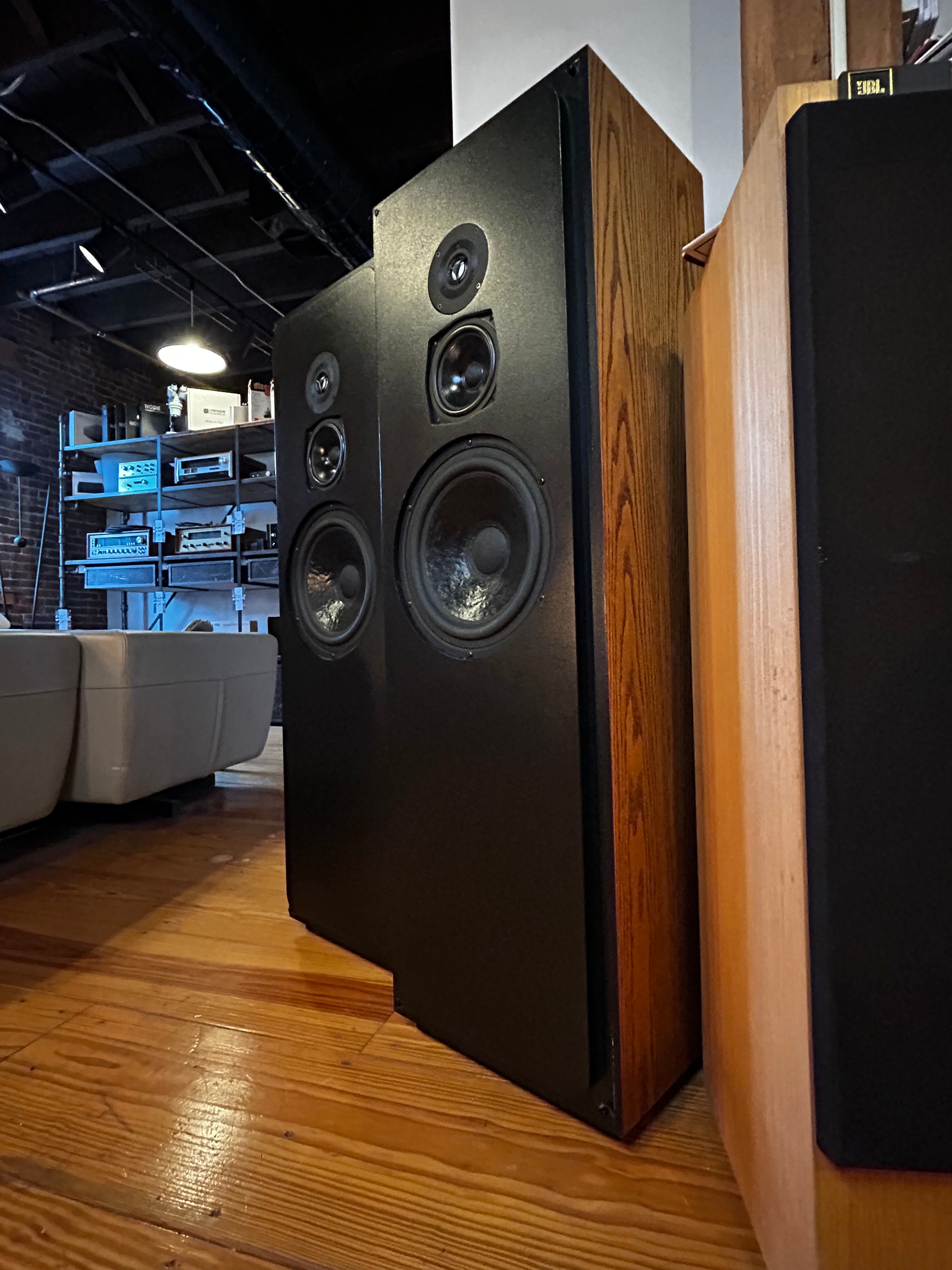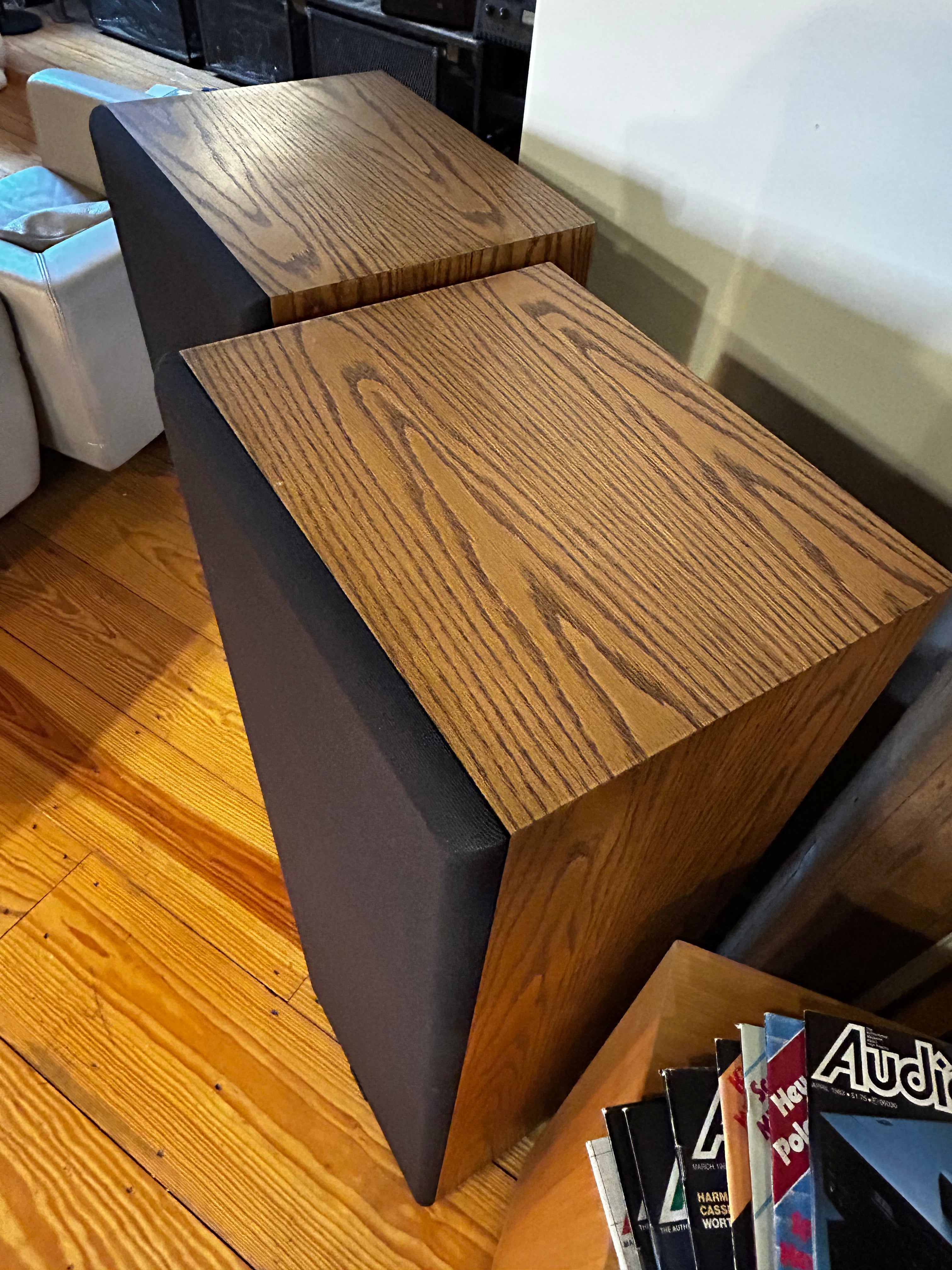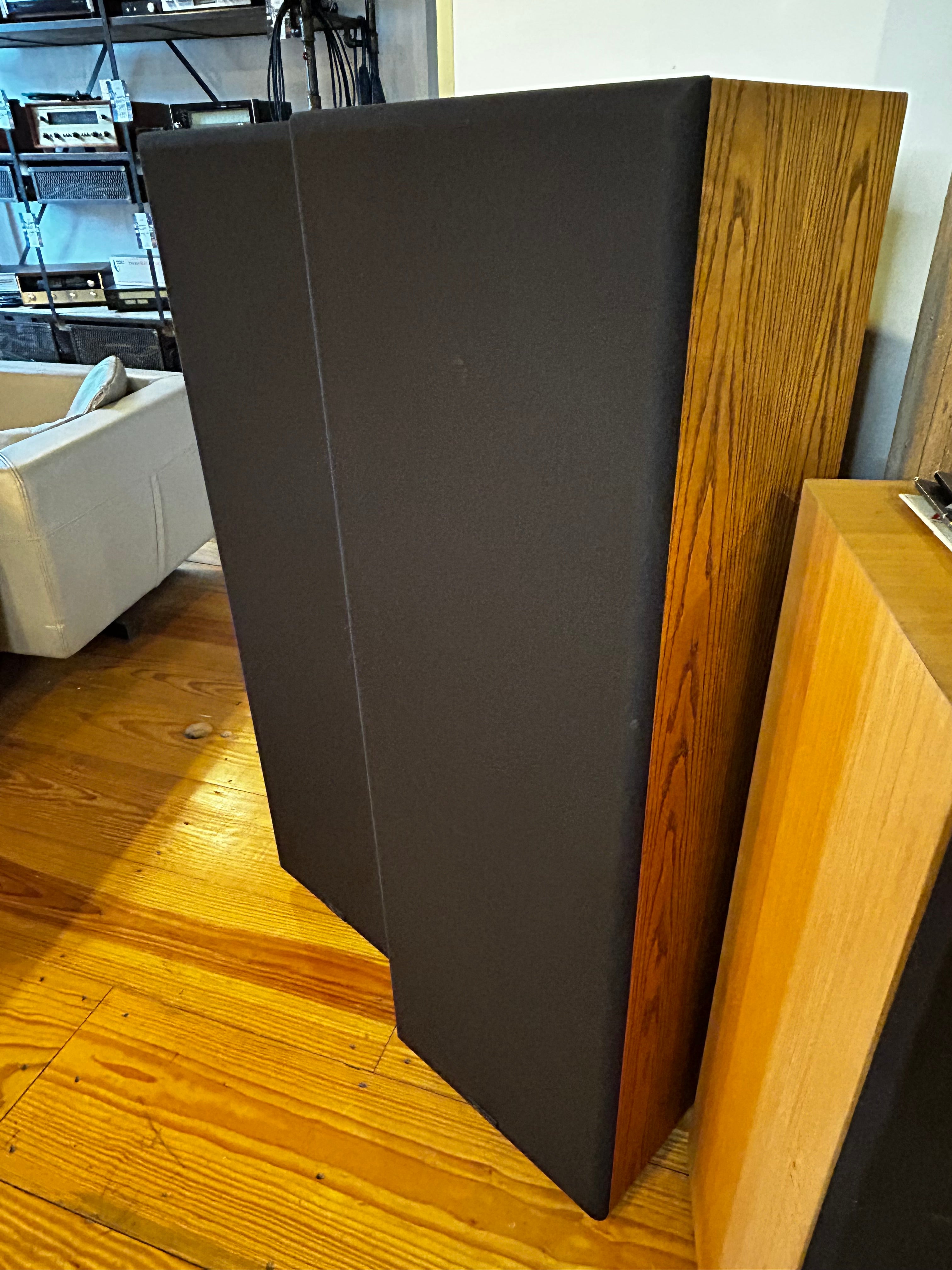 The cabinet is tall and fairly deep (approx. 46" tall, 14½" wide) yet visually restrained, with oak wood veneer and a baffle geometry intended to reduce diffraction (“Zero Diffraction baffle” as it was called).