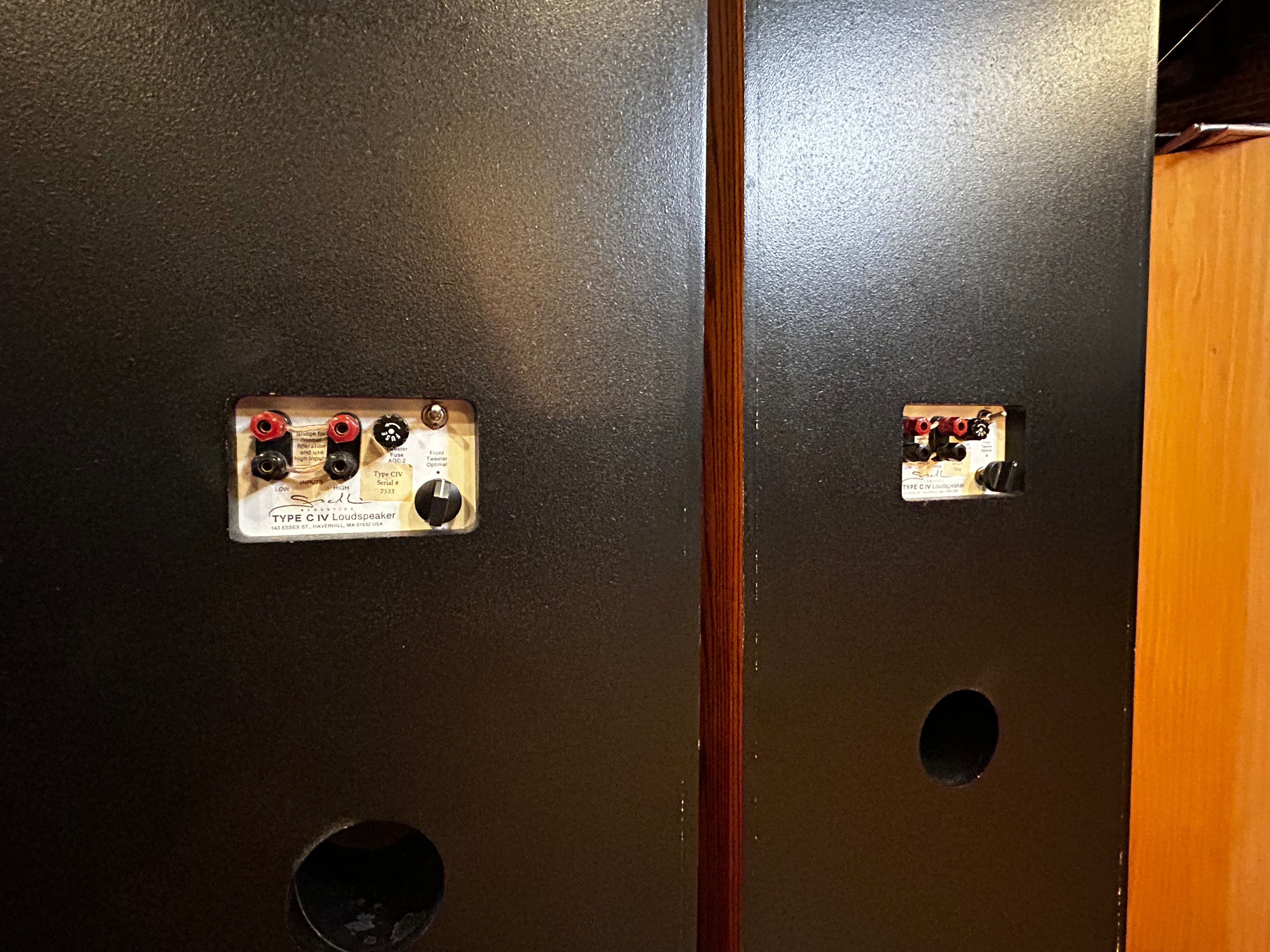 The C/IV (also referred to sometimes as CiV) is a three-way, ported design featuring a 10" woofer, 5" midrange, and 1" metal-dome tweeter in front. In addition, there is a rear-firing ¾" dome tweeter (switchable) to help restore high-frequency “air” and smooth the off-axis response as dispersion narrows in the treble. The speaker was engineered with steep, fourth-order crossover slopes (24 dB/octave) to minimize driver interaction and lobing artifacts. Snell’s design emphasis was on flat response.