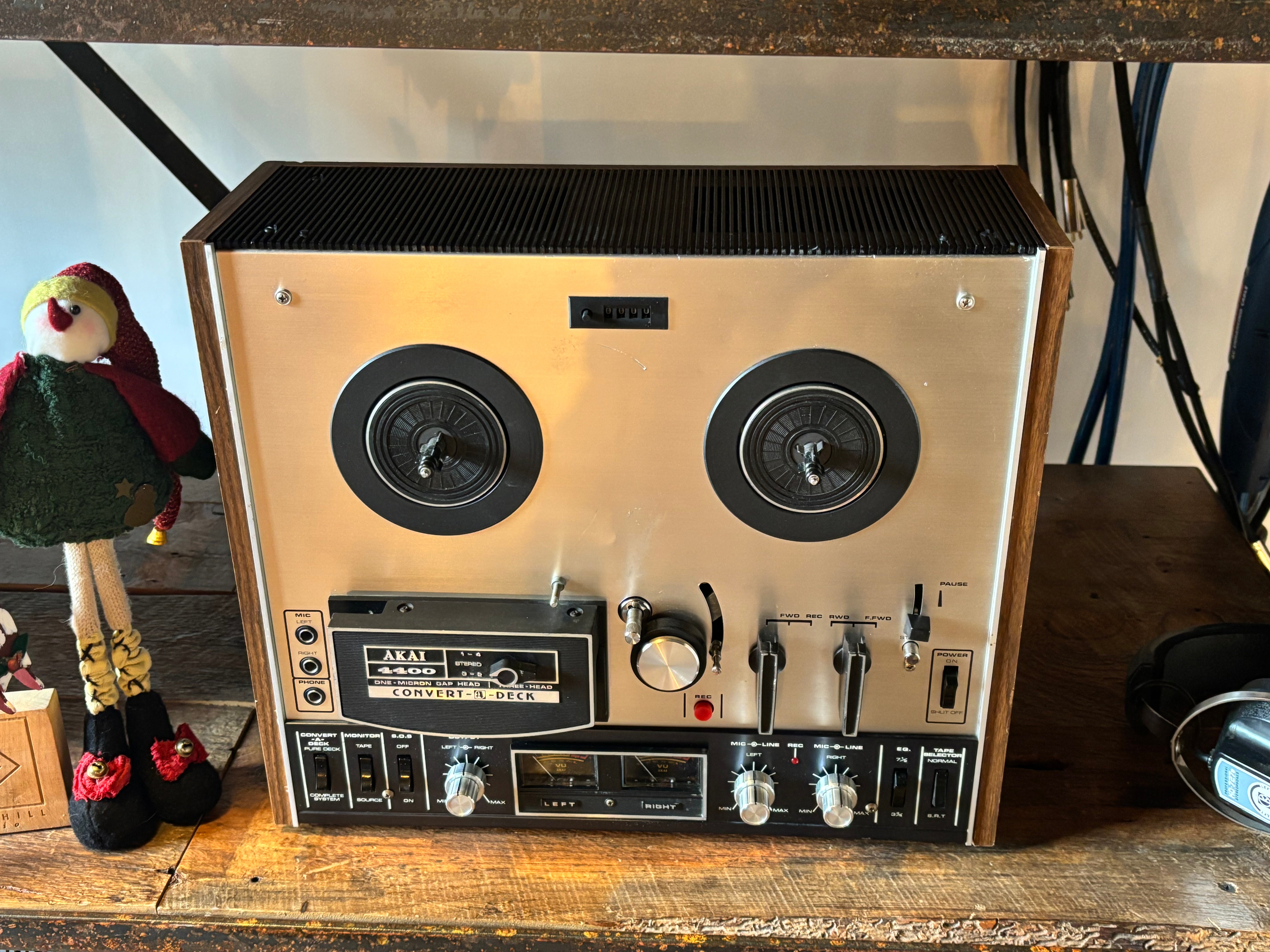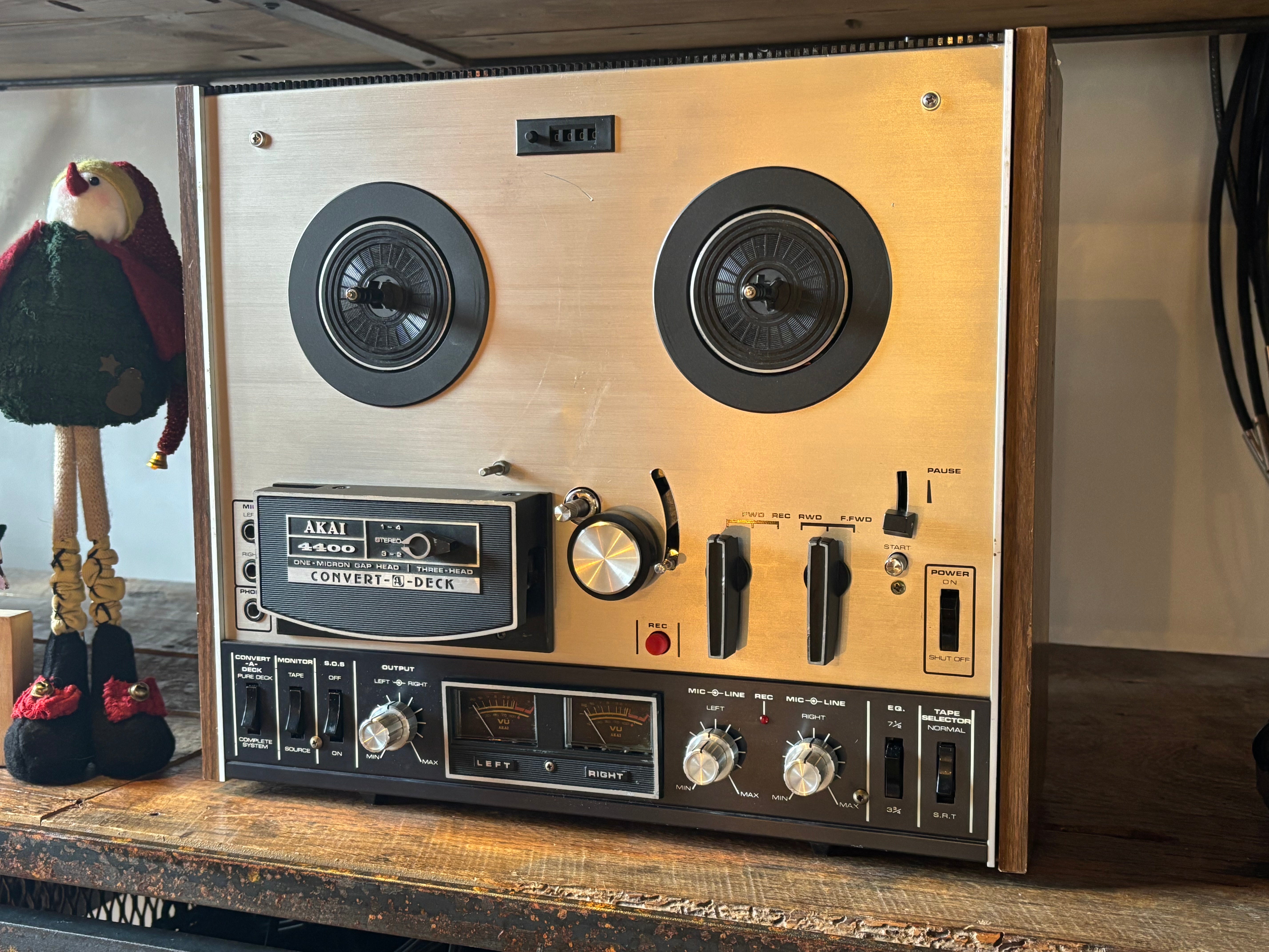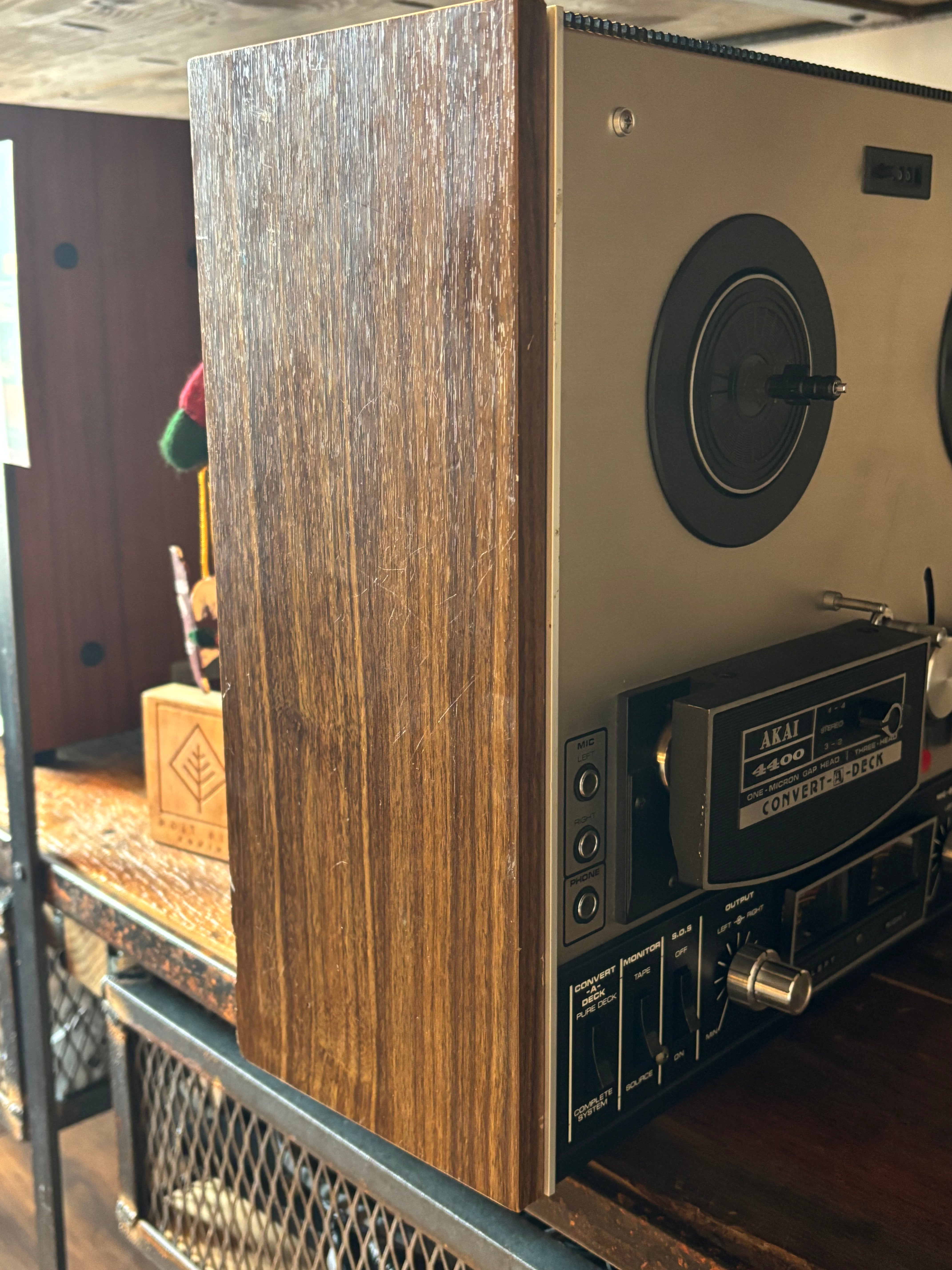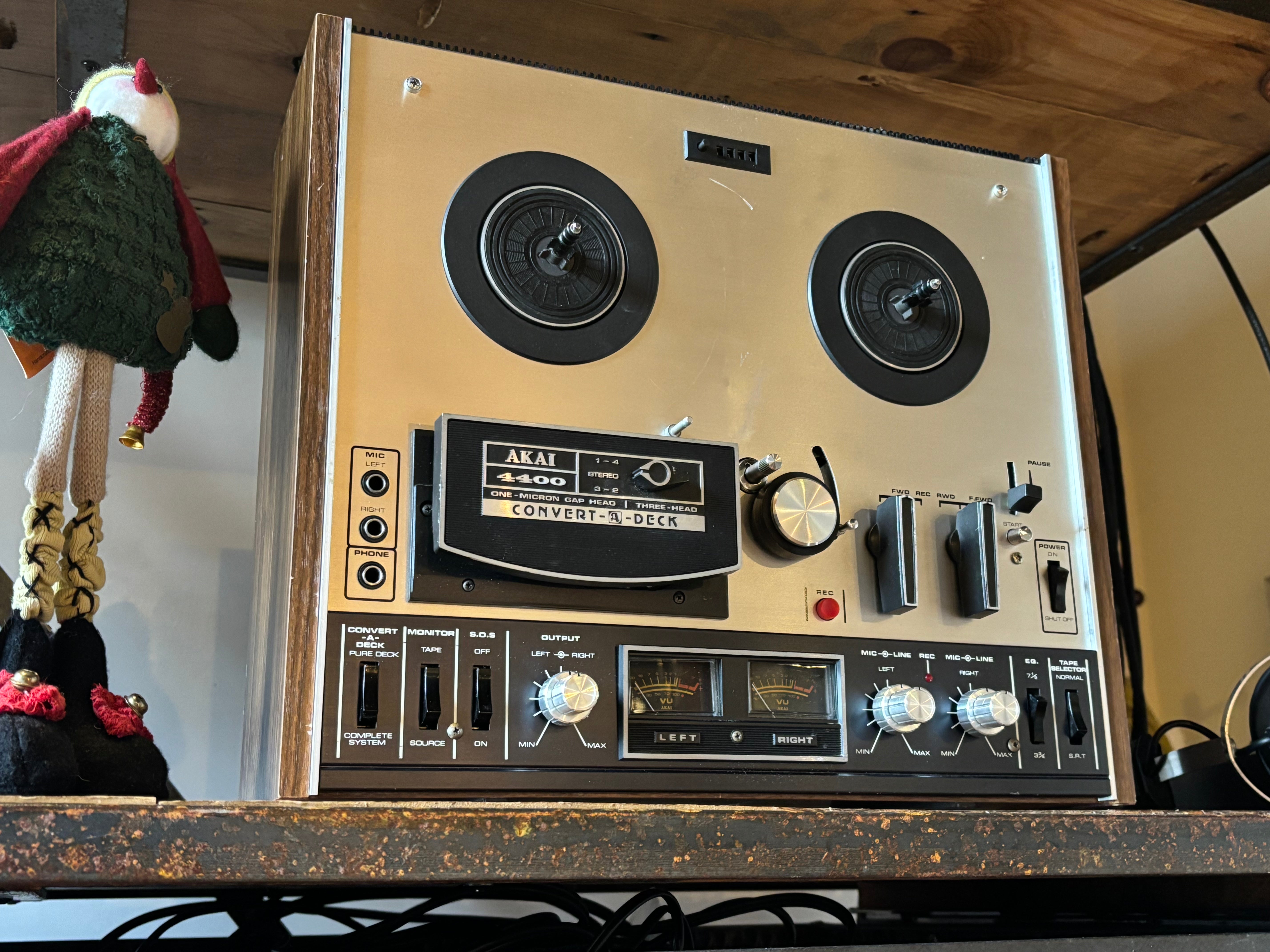 The Akai 4400 Convert-A-Deck R2R recorder and player, named because it eliminates the question of whether to buy a tape recorder or a tape deck. Instead, this machine has a simple setting that allows you to use it as either a pure deck or a complete system. It also features instant dual monitoring, pause control, automatic shut off, and VU meters. The Akai 4400 functions as both a complete recorder with built-in speakers and amplifier or as a pure tape deck by connecting to an external system; it features two speeds (3.75 & 7.5 ips), auto-shutoff, and solid mechanics, c'mon... so great!