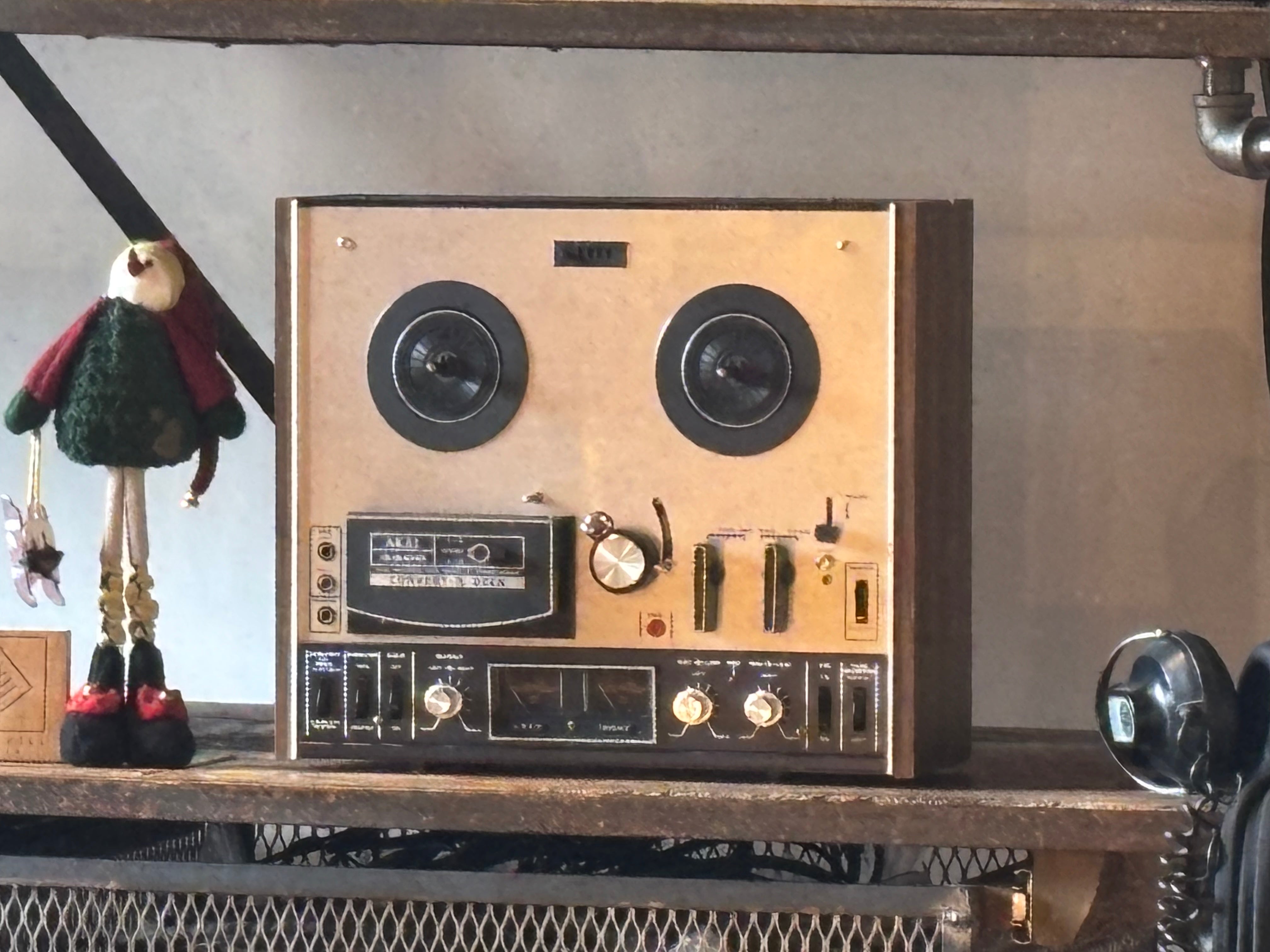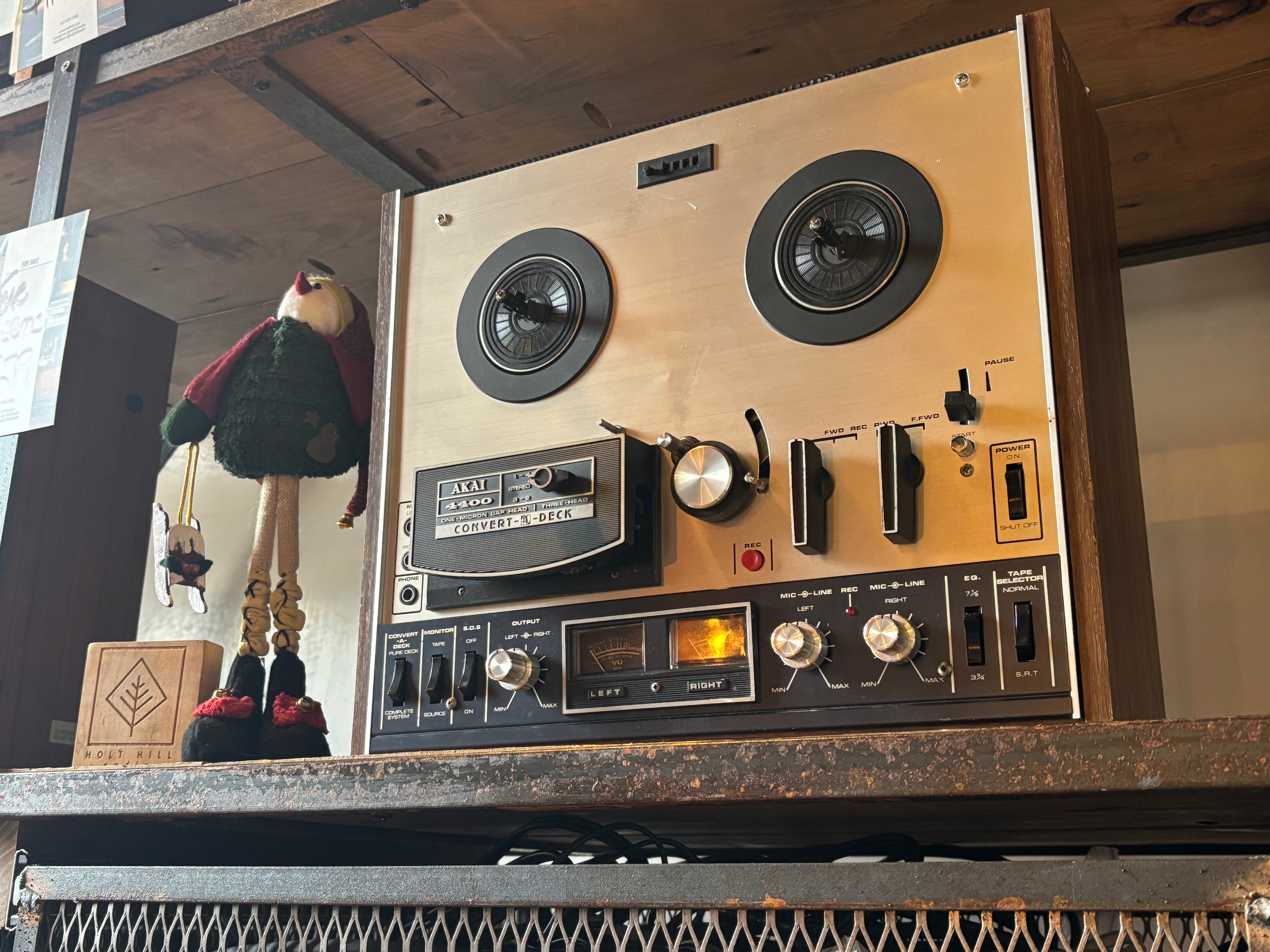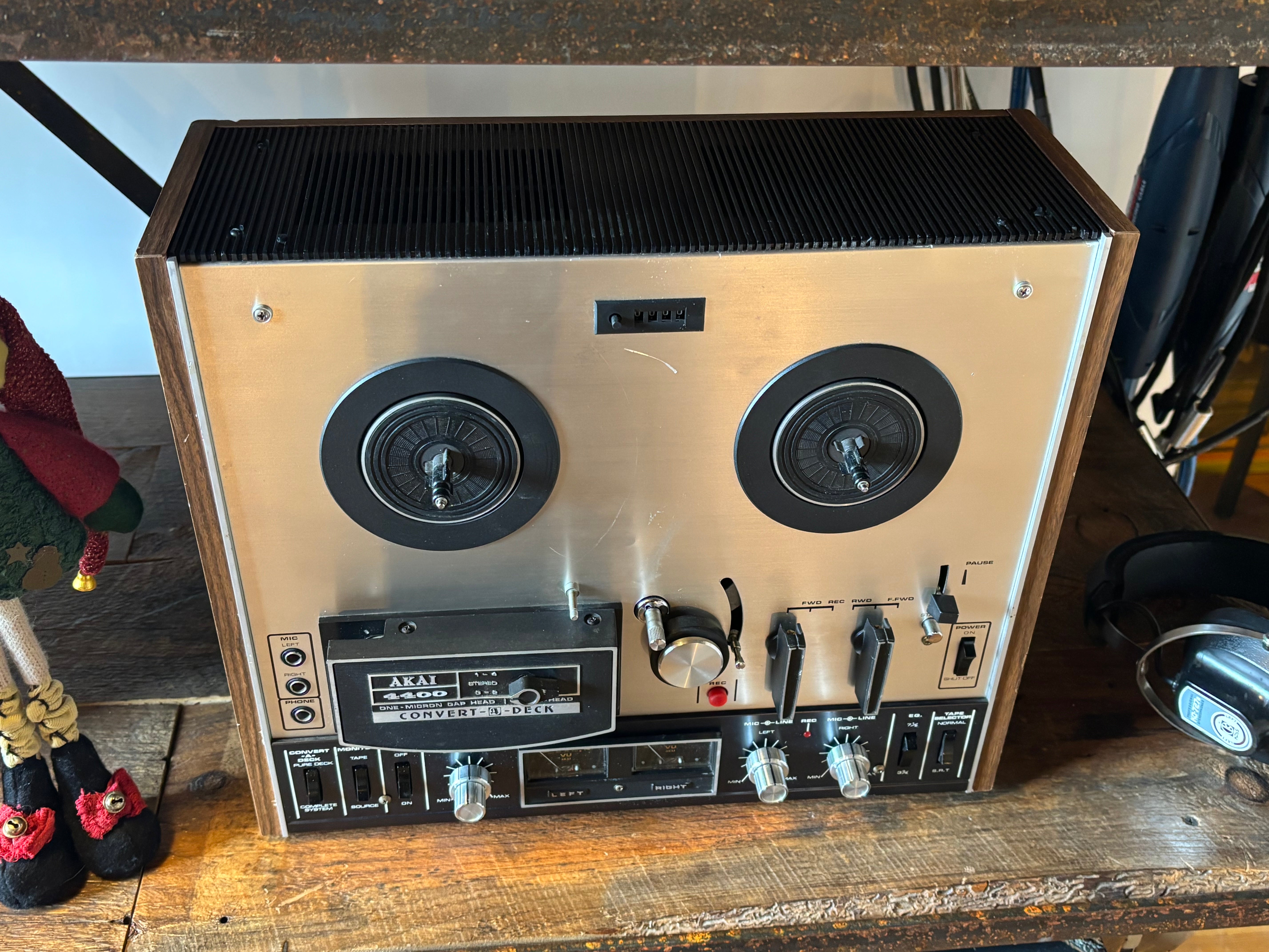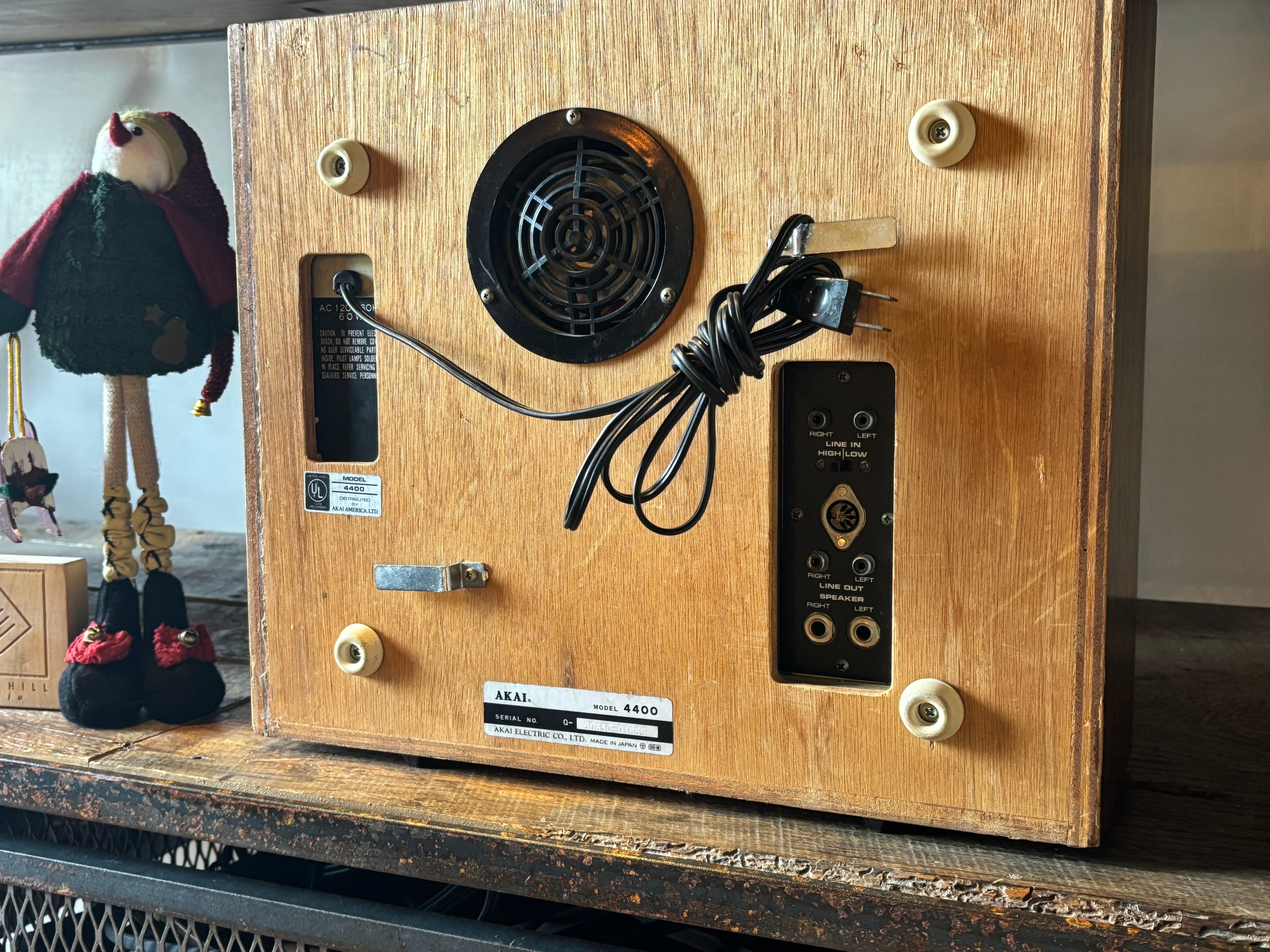 The Akai 4400 Convert-A-Deck R2R recorder and player, named because it eliminates the question of whether to buy a tape recorder or a tape deck. Instead, this machine has a simple setting that allows you to use it as either a pure deck or a complete system. It also features instant dual monitoring, pause control, automatic shut off, and VU meters. The Akai 4400 functions as both a complete recorder with built-in speakers and amplifier or as a pure tape deck by connecting to an external system; it features two speeds (3.75 & 7.5 ips), auto-shutoff, and solid mechanics, c'mon... so great!