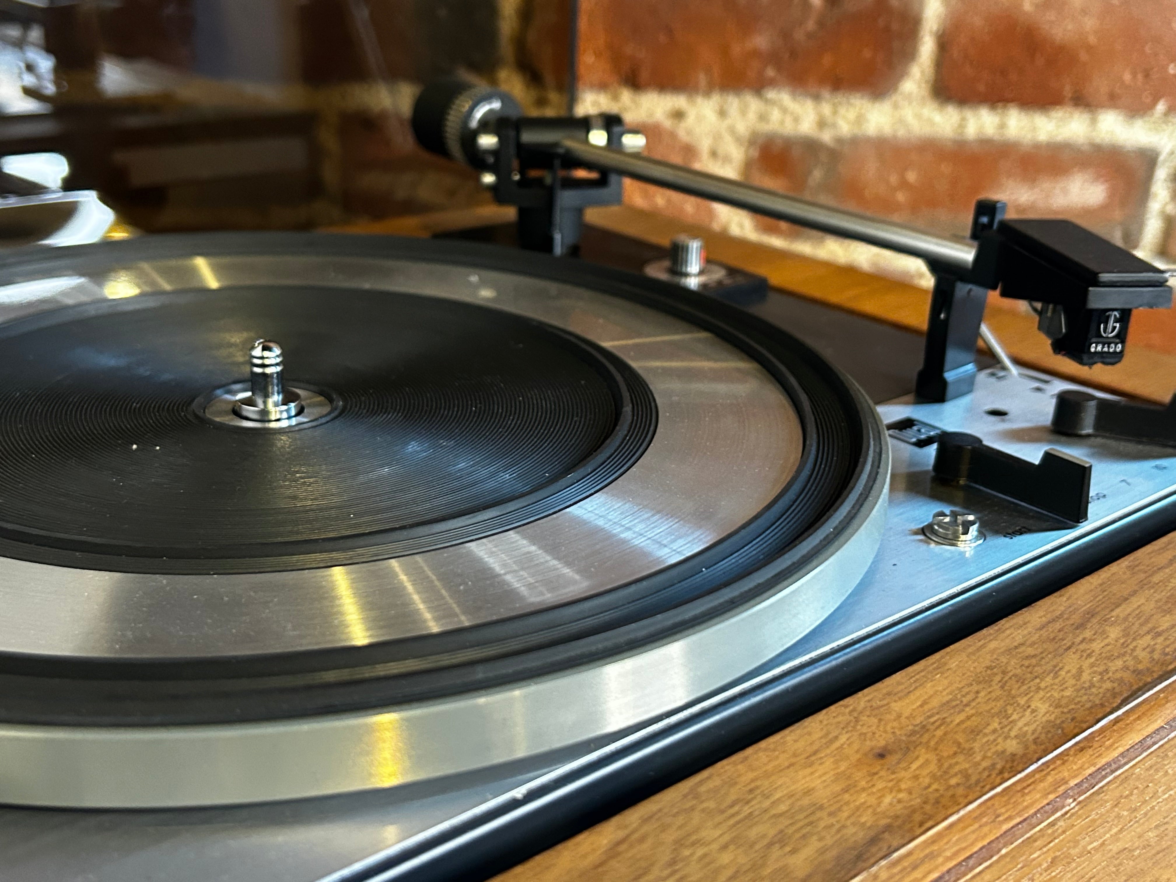 Fitted with a Grado moving magnet cartridge with relatively new "Green" stylus, this table is ready to spin tunes over and over again, with accuracy and clean sound. And the walnut plinth finishes off the whole look. A lovely detailed piece from front to back.